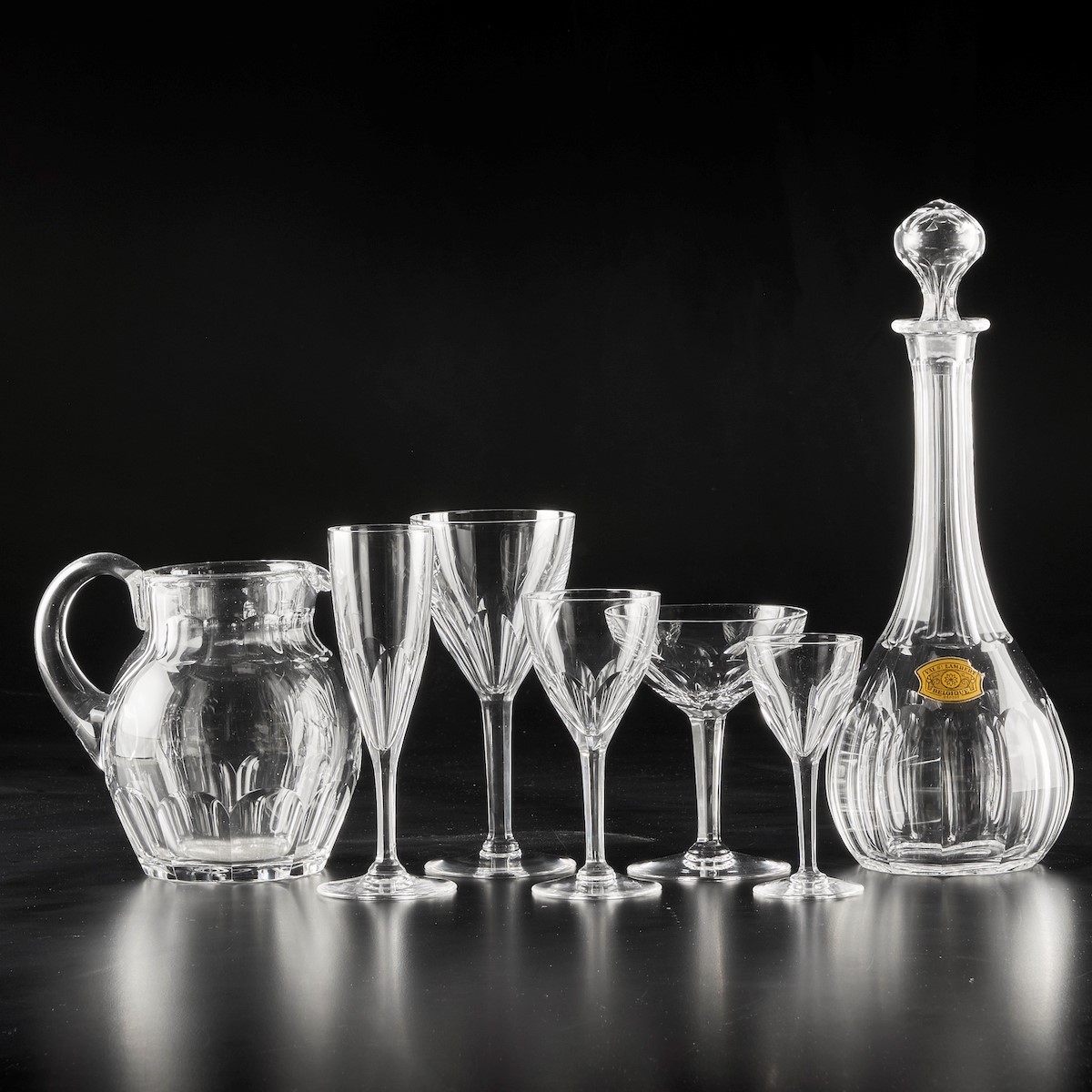 Il servizio per 6 persone è così composto: 6 calici da acqua; 6 calici da vino; 6 calici da rosolio; 6 coppe da champagne; 5 flûtes; 1 caraffa; 1 bottiglia con tappo.