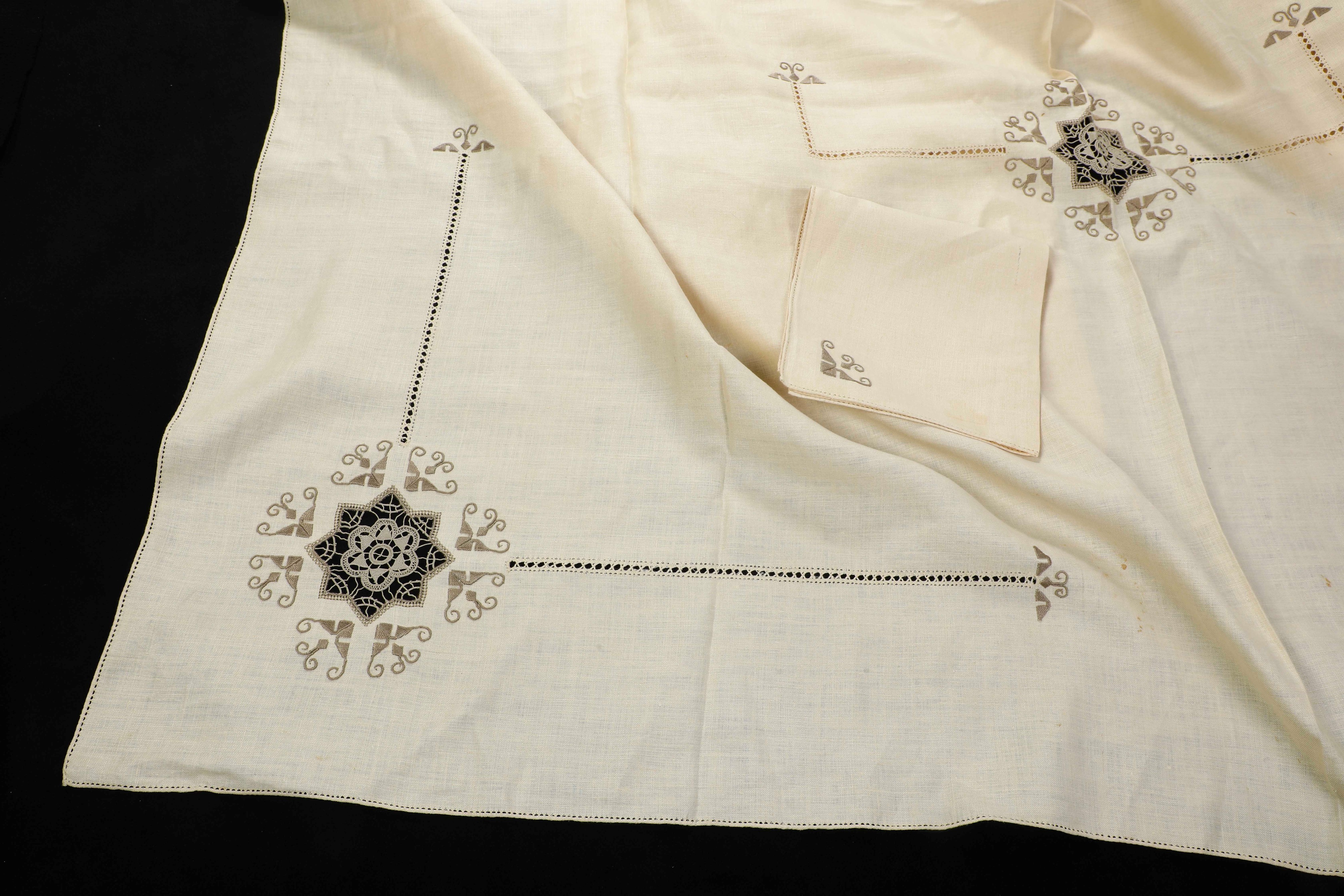 Lino color crema e ricami in filo grigio a motivi geometrici. Dimensioni: tovaglia cm 125x270; tovaglioli cm 42x42. Conservazione: qualche macchia su alcuni tovaglioli.