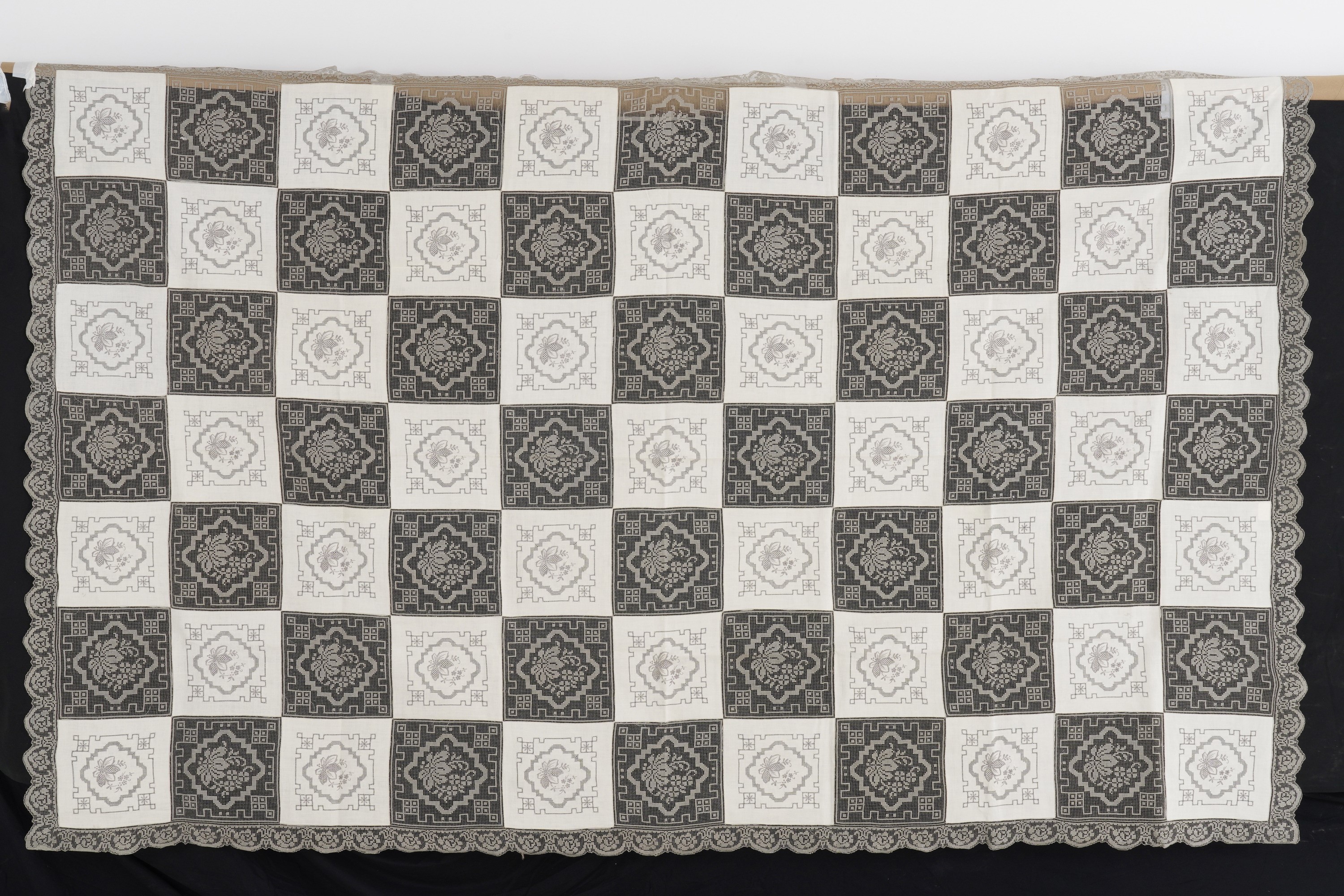 Motivo a scacchiera in pizzo filet color grigio perla. Dimensioni: cm 277x180. Conservazione: tovaglia e tovaglioli con piccole sgualciture e macchie.