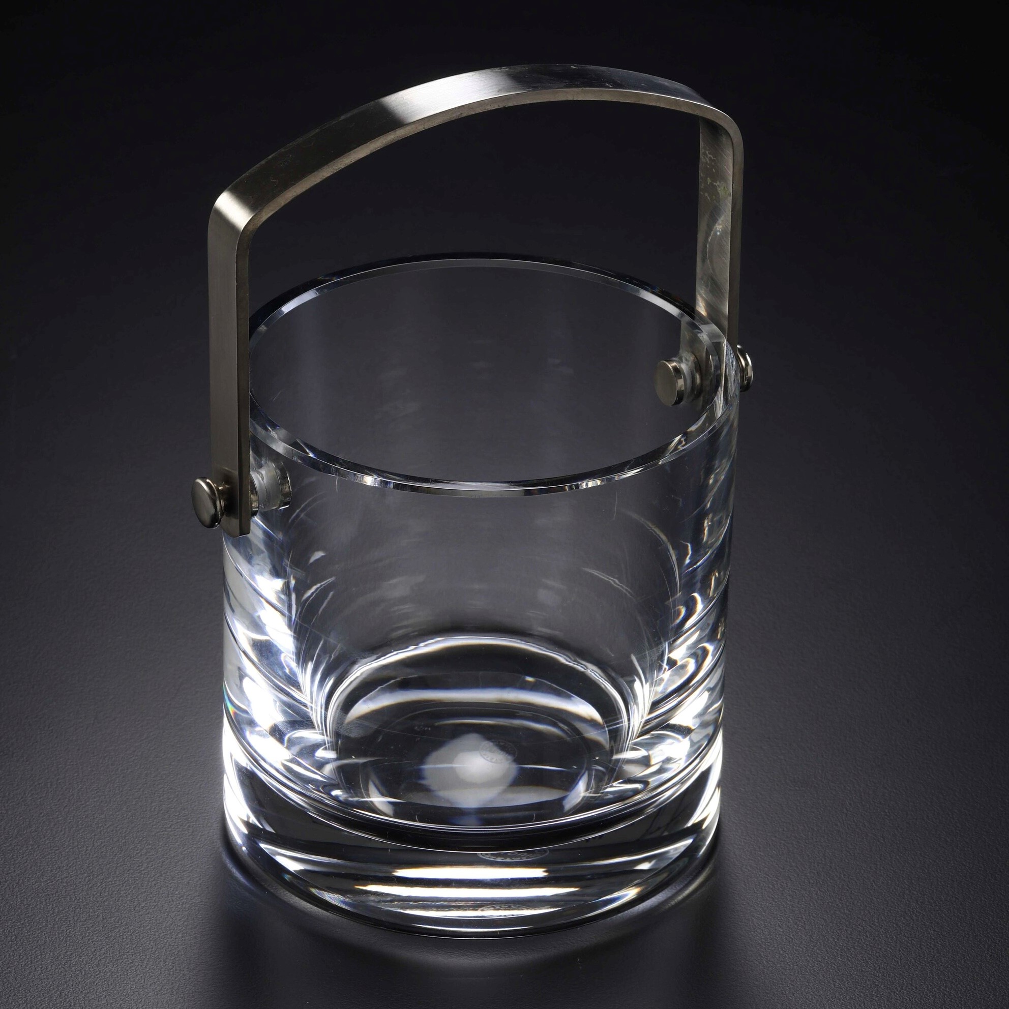 Cristallo e acciaio inossidabile. Altezza: cm 12; diametro: cm 12; Conservazione: ottima.