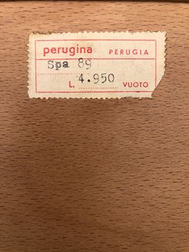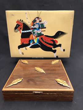 la scatola in legno col coperchio decorato con foglie dorate in rilievo era destinata a contenere cioccolatini Perugina; l’altra, nata per cioccolatini Motta, dipinta su seta con cavaliere nipponico. Un piccolo strappo in alto a destra della scatola dipinta. cm 26x26 e cm 39x28,7