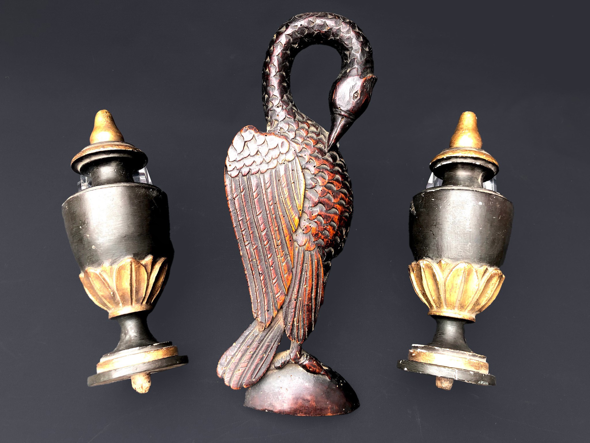 una scultura raffigurante pellicano e una coppia di perettoni dipinti, H scultura cm 31,7 H perettoni cm 22