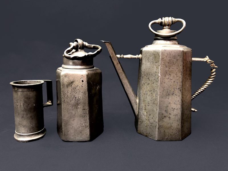 3 OGGETTI IN PELTRO DI FOGGE E EPOCHE DIVERSE, UNO RECA LA DATA 1760