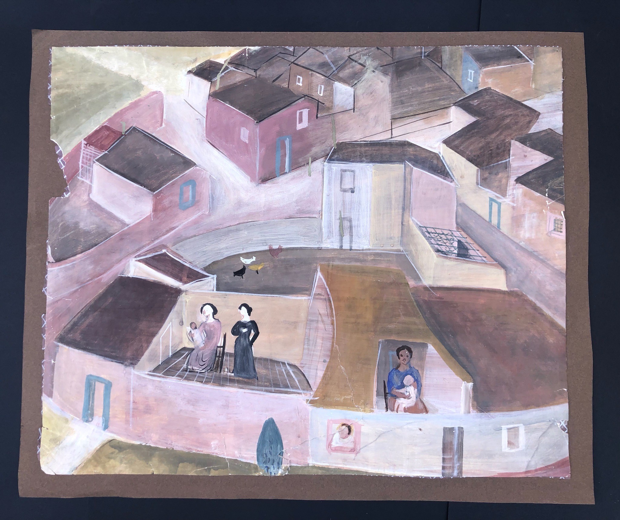 ANONIMO, 1950 ca. VEDUTA CON CASE E FIGURE MULIEBRI