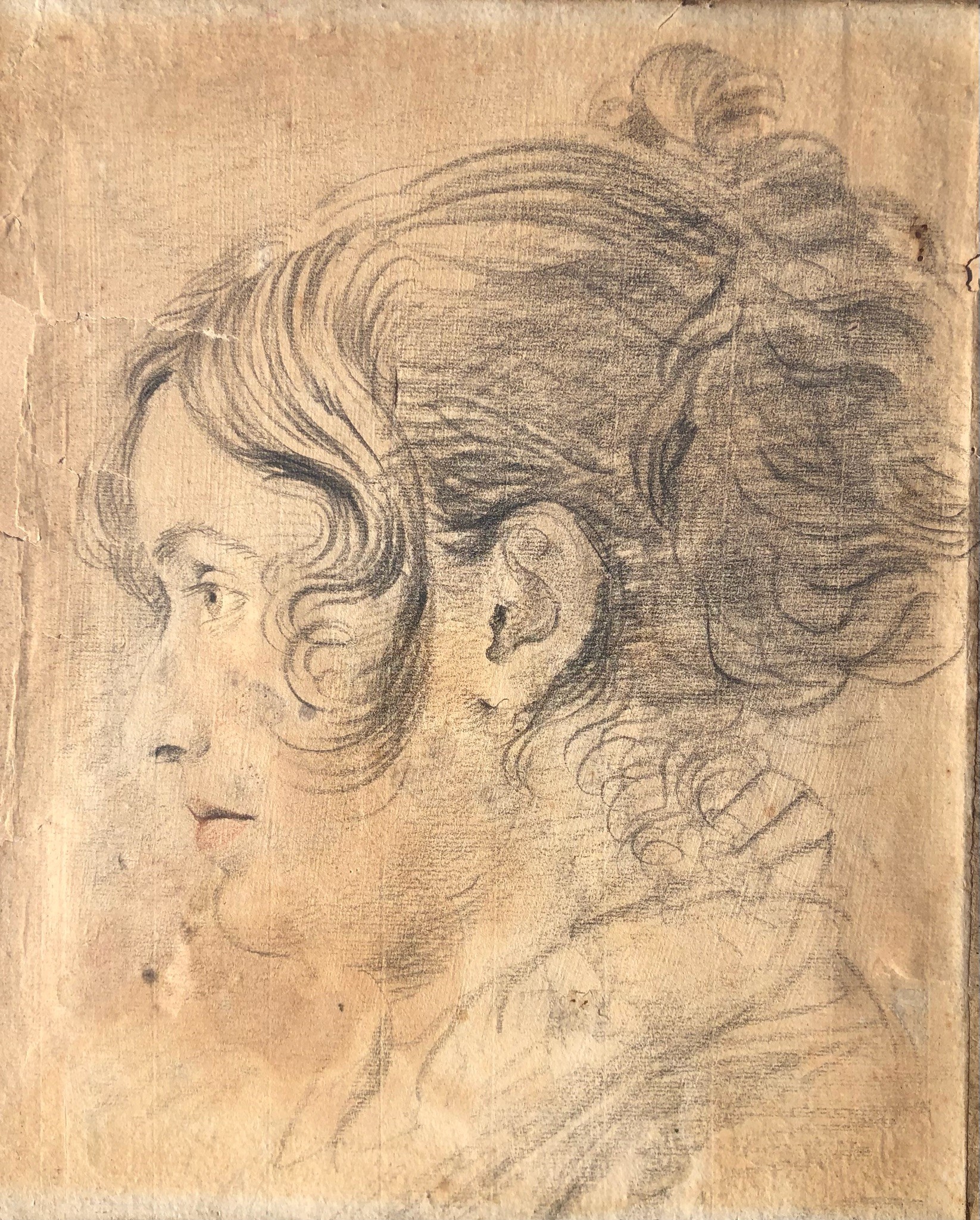 Il disegno (“Profilo di giovane donna volta a sinistra”), certamente un ritratto, è realizzato a matita e a pastello su carta vergellata. misure cornice cm 48x42,5; misure disegno cm 27,5x22,5