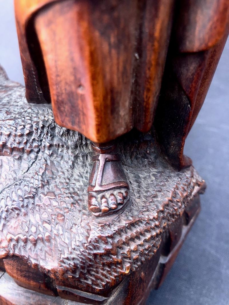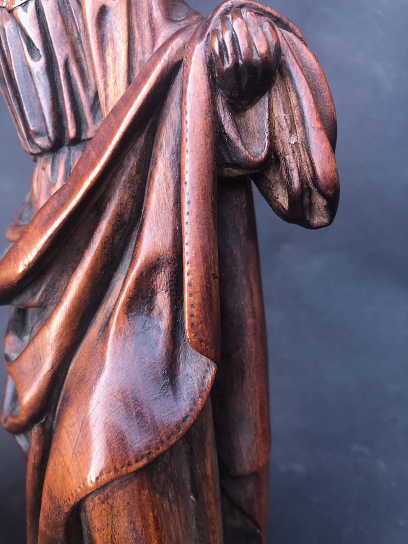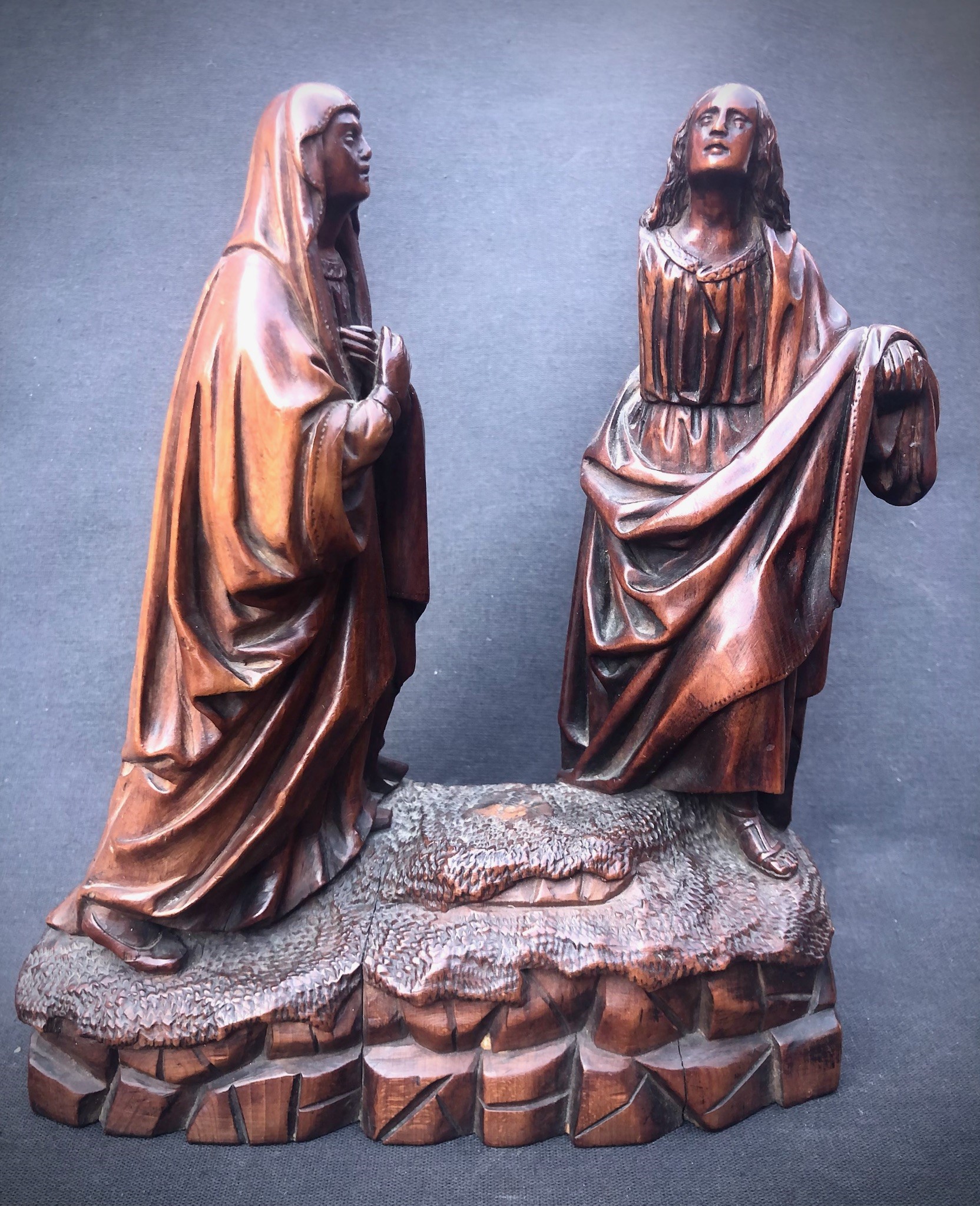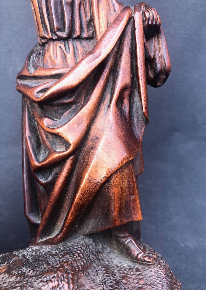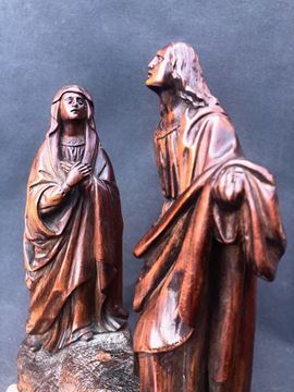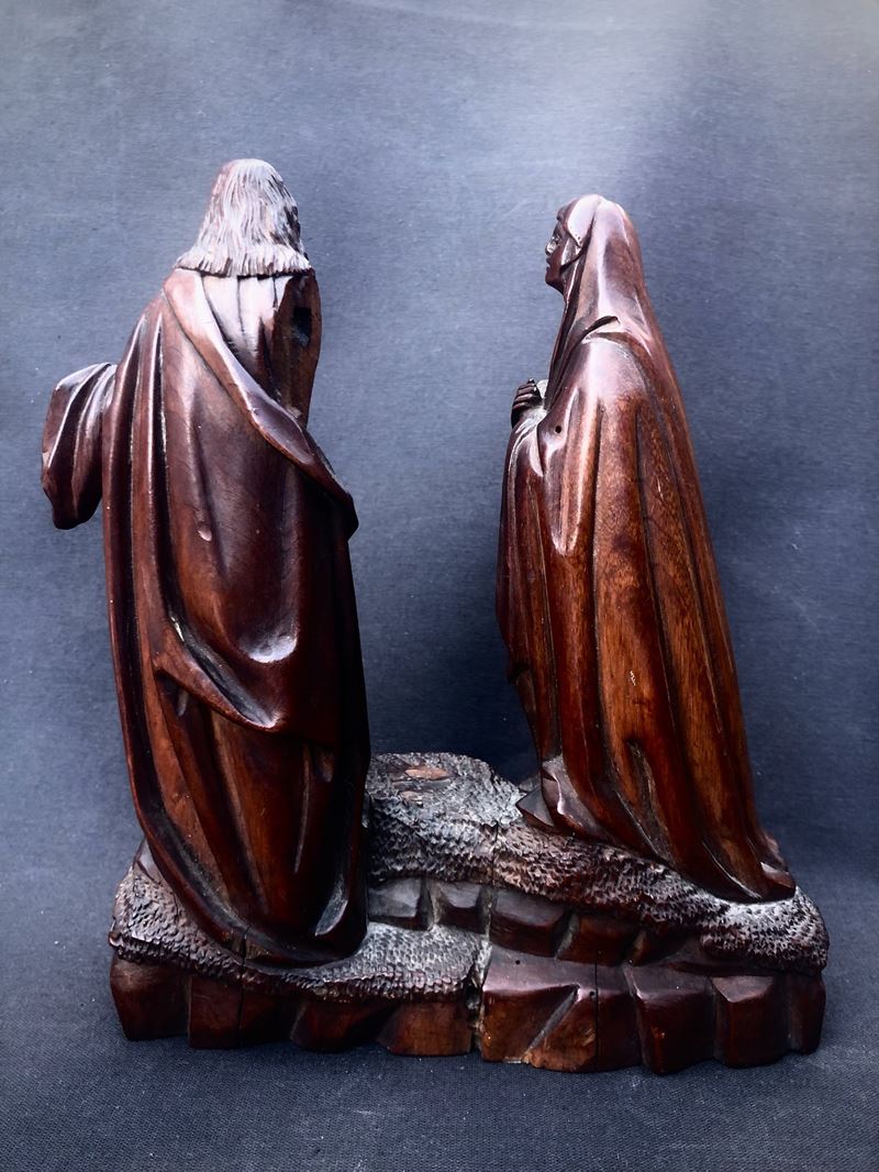 Pur priva della croce e del braccio destro del San Giovanni, la scultura conserva un forte fascino dovuto - oltre al tipo di materiale - alla splendida patina e alla minuziosa, “fiamminga” qualità dell’intaglio. H cm 23,5 larghezza cm 21,5