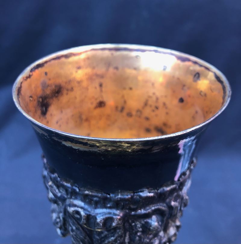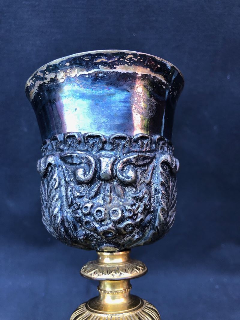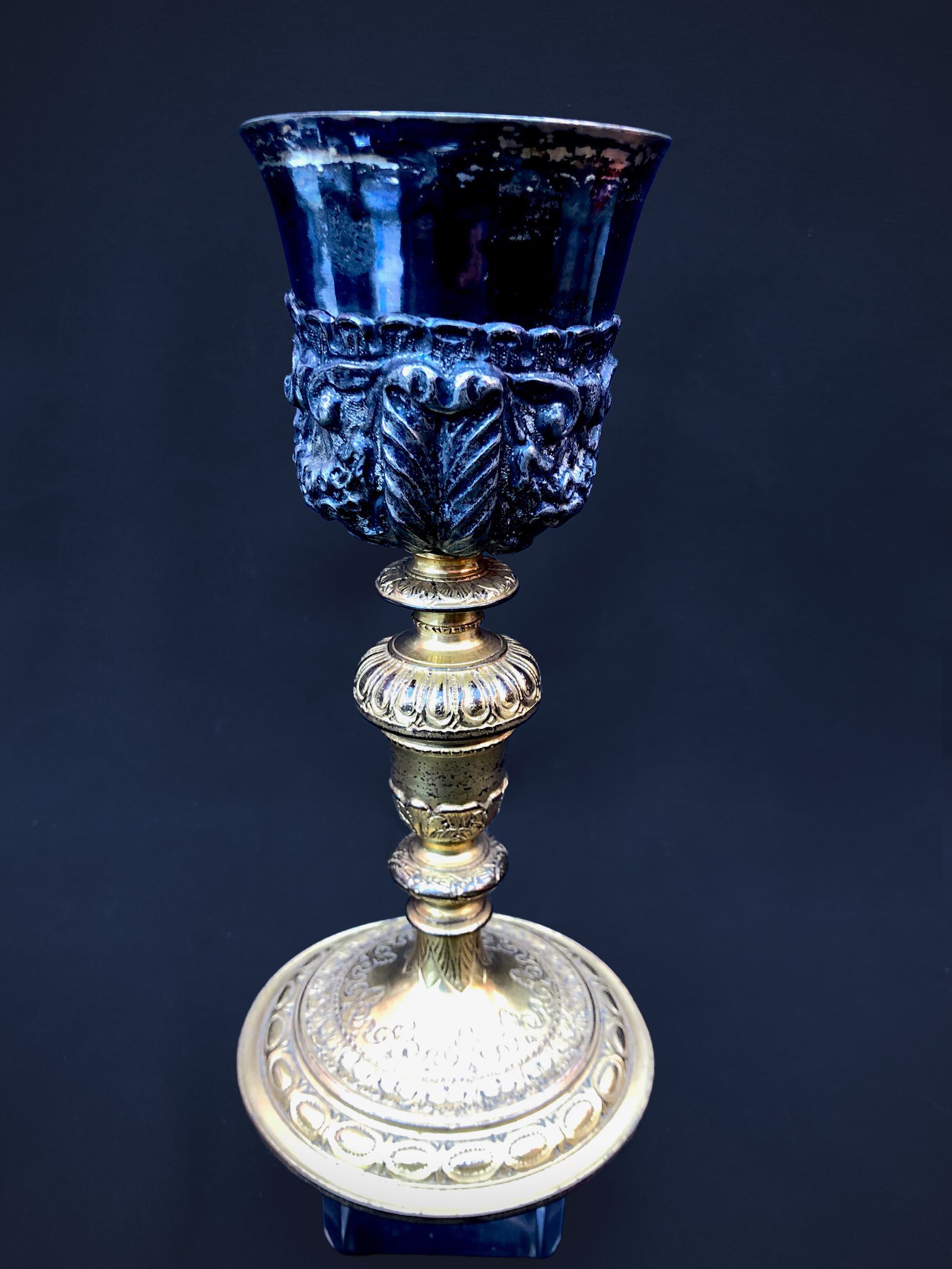 CALICE IN BRONZO DORATO ED ARGENTO INCISO E SBALZATO, XVII-XVIII, SECOLO