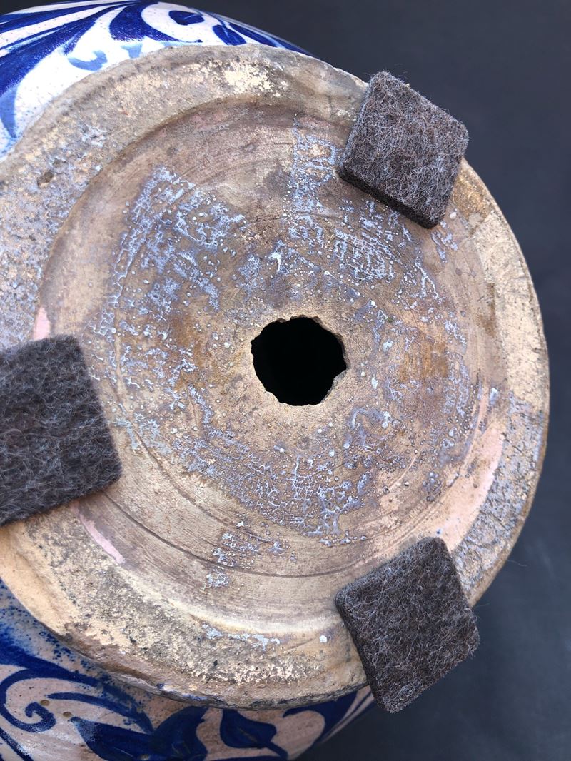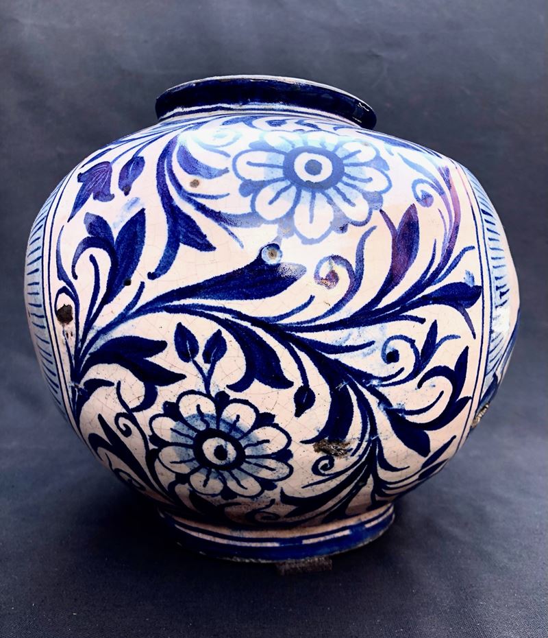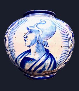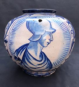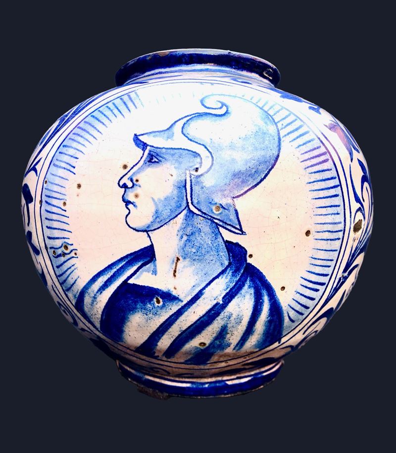 in forma globulare, decorato con fiorami e 2 profili di guerrieri entro riserva. Danni: al vaso sono stati praticati 3 fori: uno sul fondo, 2, più piccoli, in prossimità delle figure