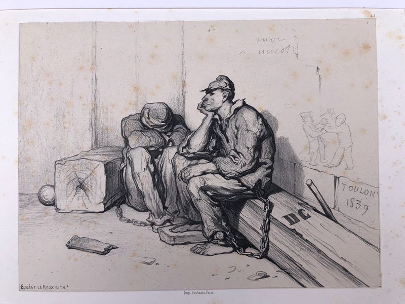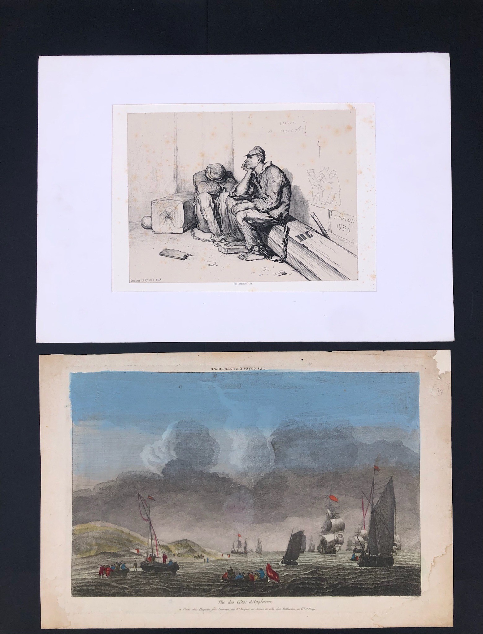 un incisione acquerellata raffigurante “Les cotes d’Angleterre” e una litografia rappresentante “Forzati”