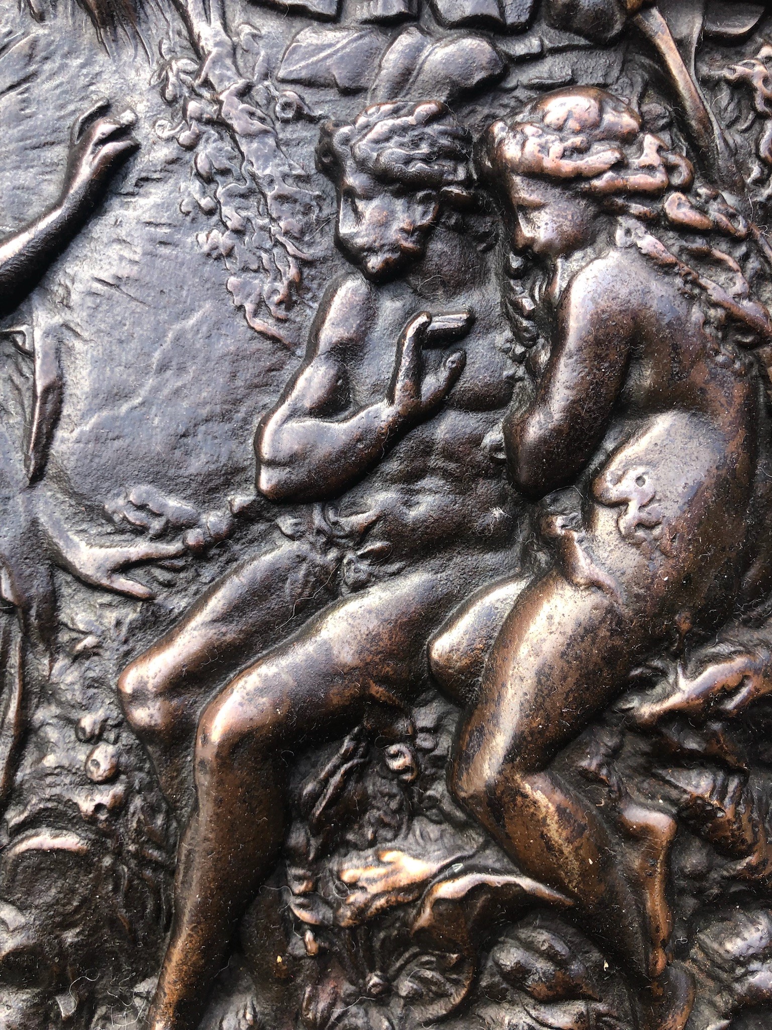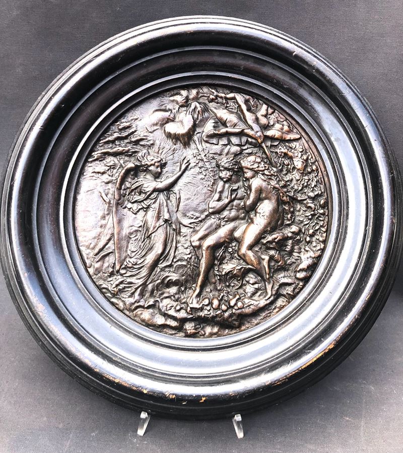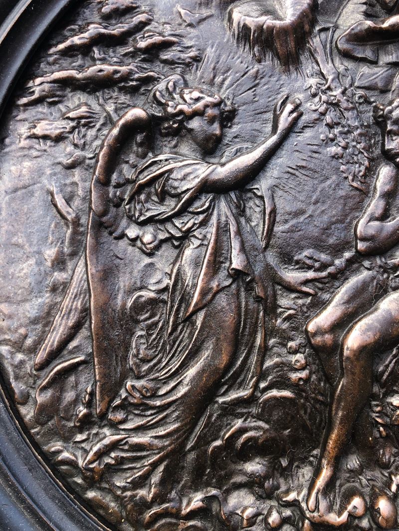 bronzo patinato entro cornice rotonda in legno ebanizzato. Diametro bronzo cm 24,5; diametro cornice cm 37