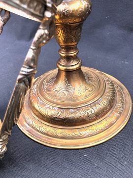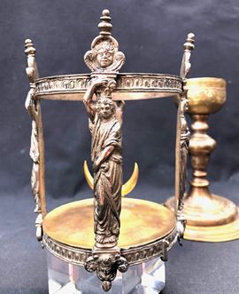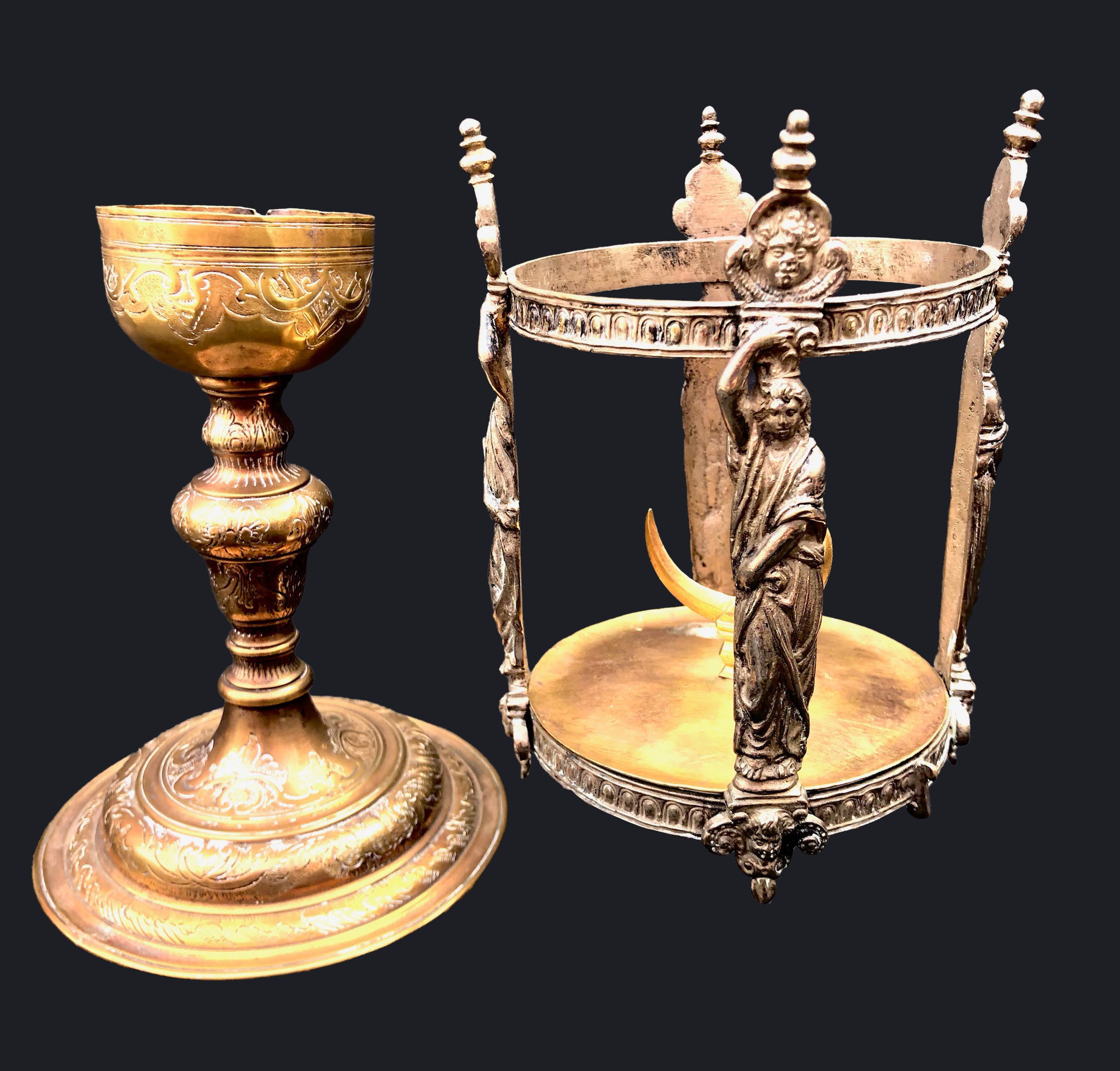 si compone di un calice (mancante di parte della coppa) e della parte superiore di un ostensorio figurato con cariatidi ed angeli in metallo parzialmente dorato, H calice cm 15,5 H ostensorio cm 14