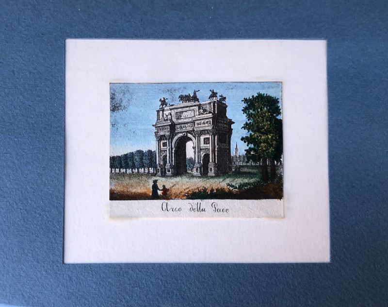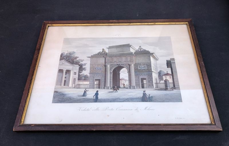 Veduta della porta Comasina, cm 41,5 x 32, colorata a mano, in cornice;