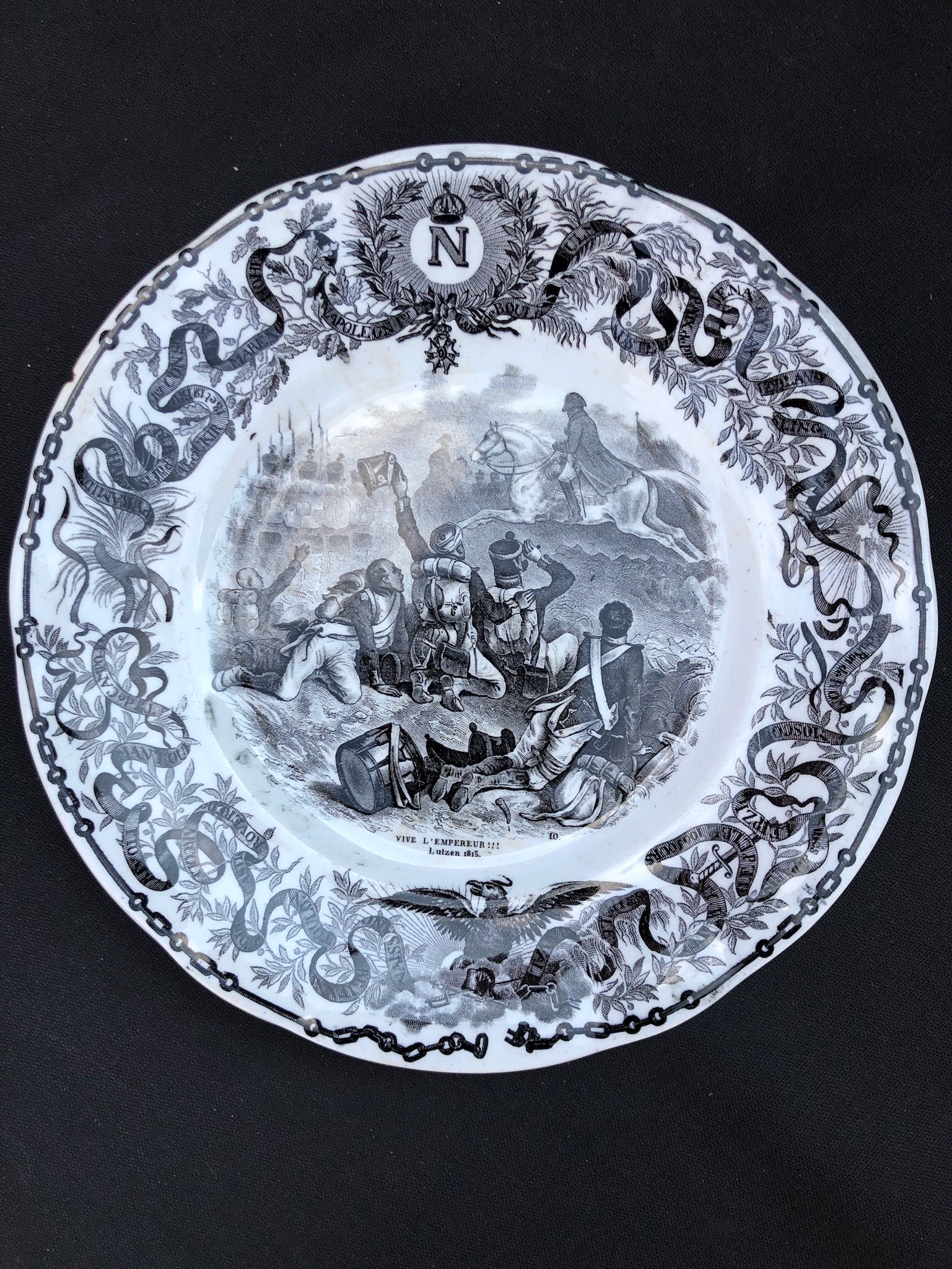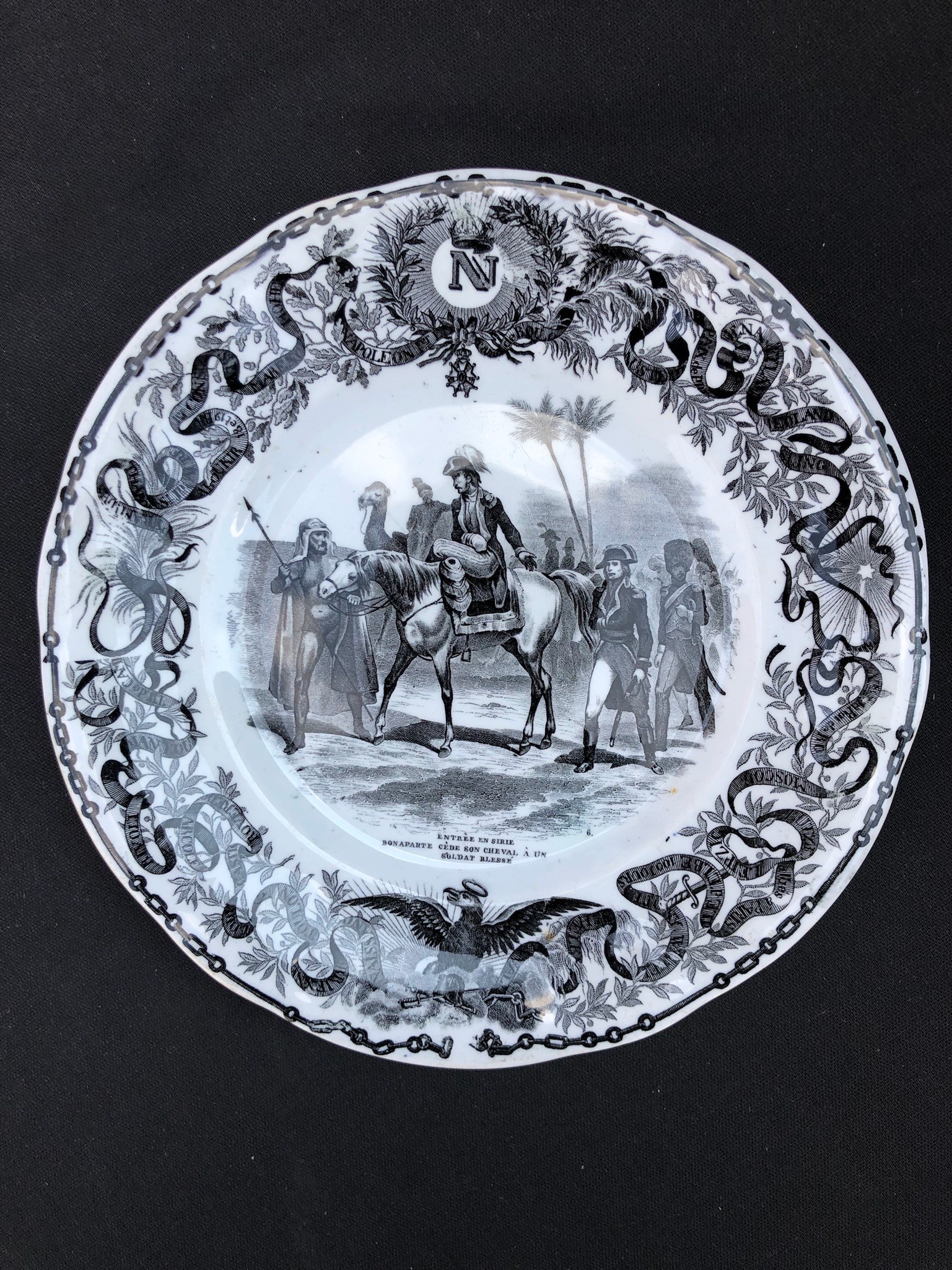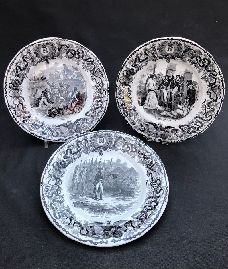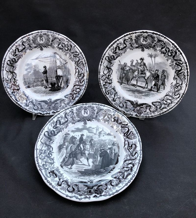 ogni piatto è sormontato dalla N di Napoleone, in basso figura l’aquila imperiale. Sui bordi, intorno alla scena principale, corre un nastro che riporta i nomi delle località che hanno segnato le tappe della vita dell’imperatore. 3 piccole sbeccature sul retro di 3 piatti. Per il resto buona conservazione.