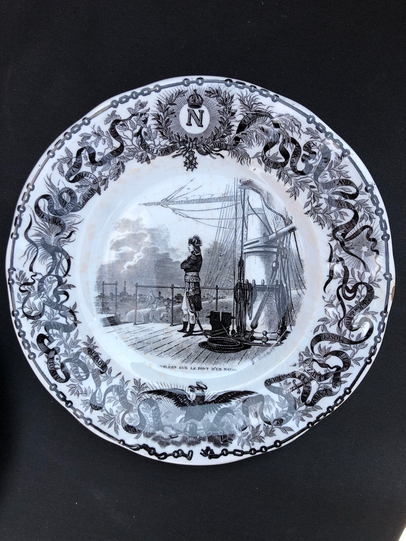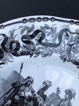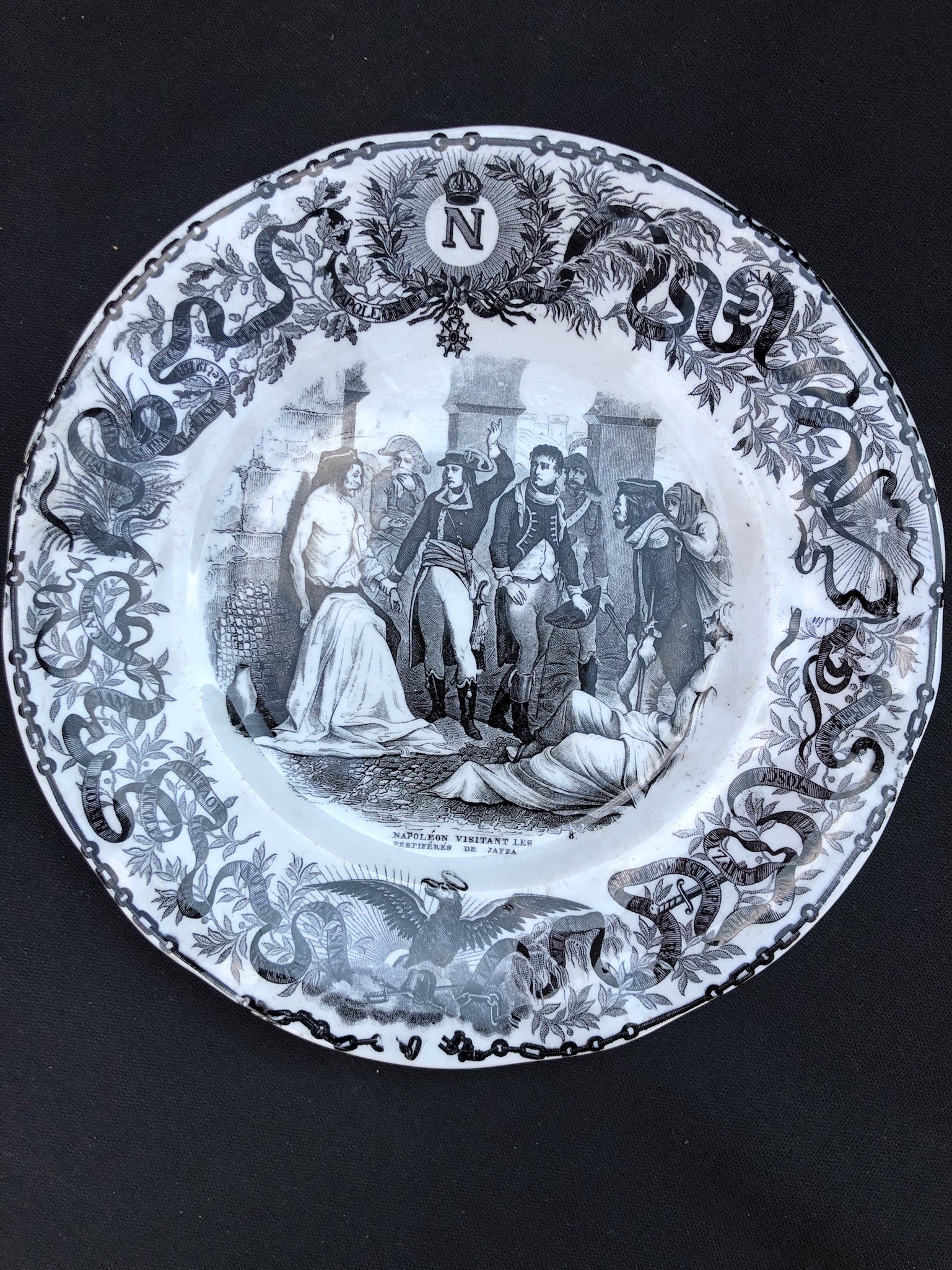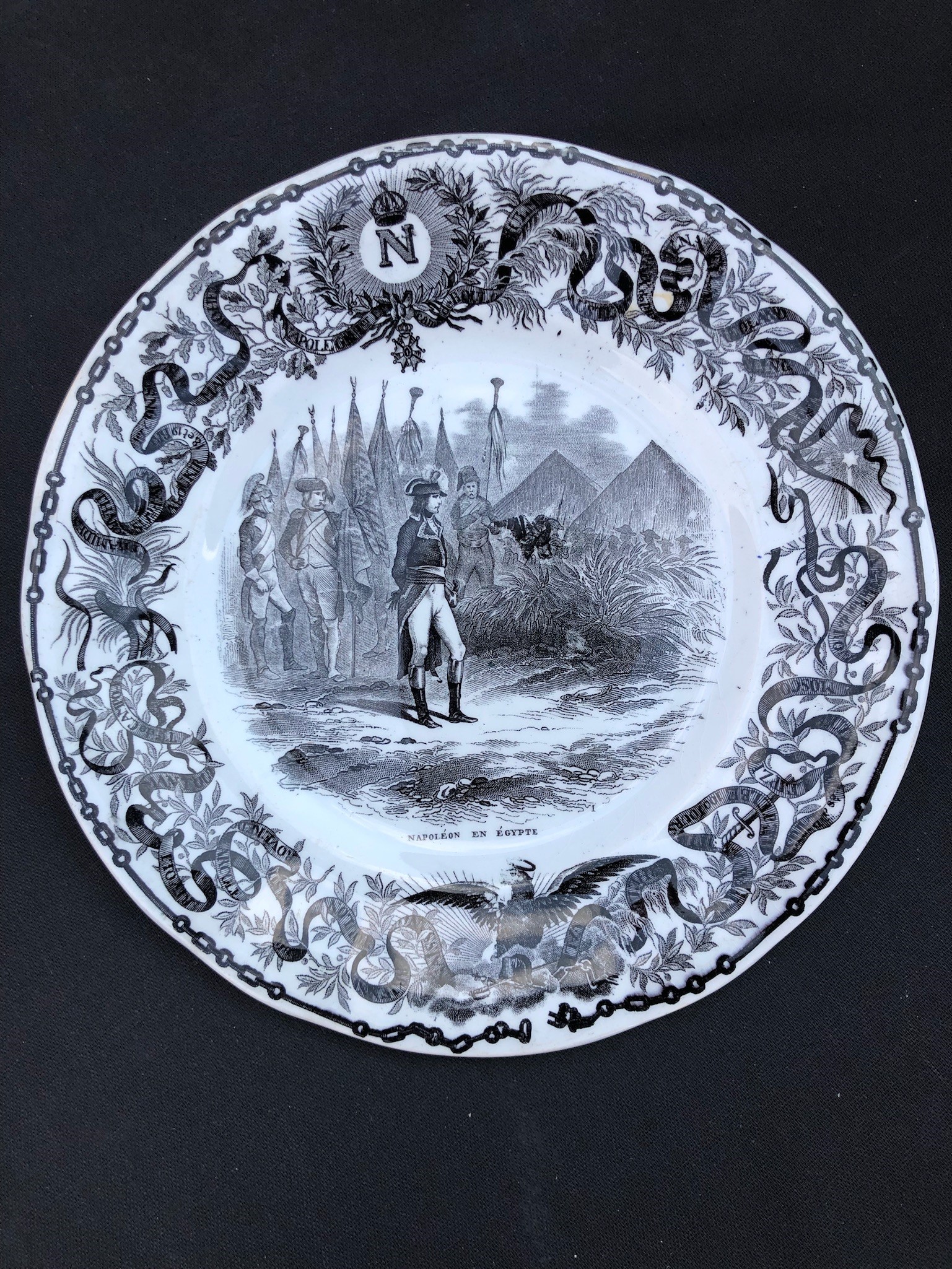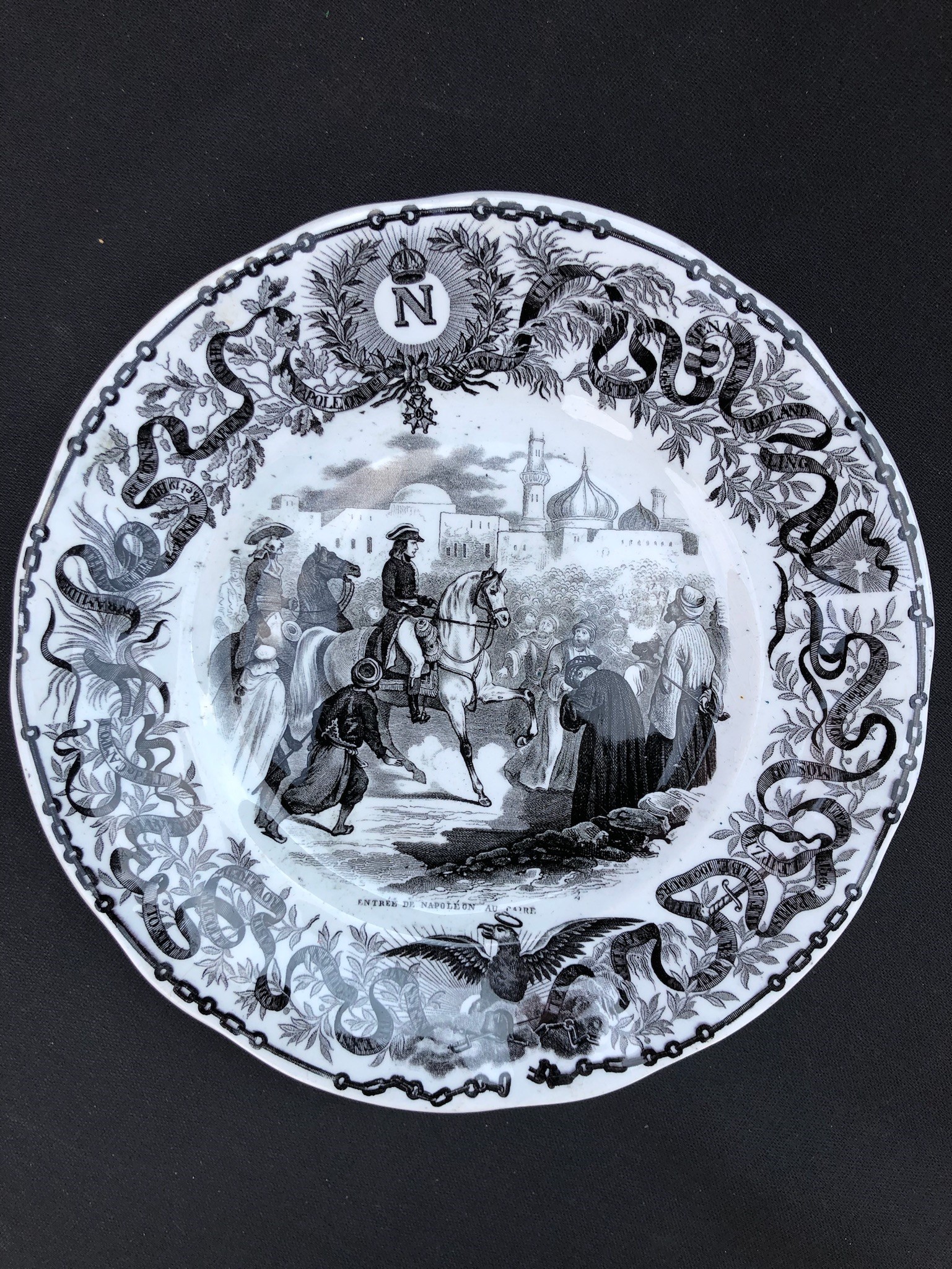 ogni piatto è sormontato dalla N di Napoleone, in basso figura l’aquila imperiale. Sui bordi, intorno alla scena principale, corre un nastro che riporta i nomi delle località che hanno segnato le tappe della vita dell’imperatore. 3 piccole sbeccature sul retro di 3 piatti. Per il resto buona conservazione.