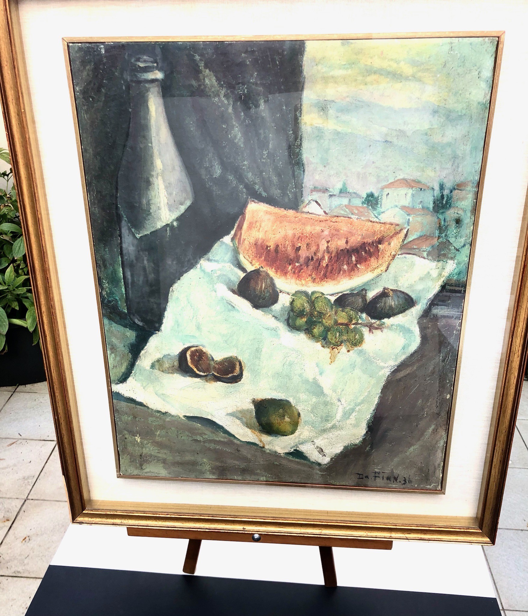 NATURA MORTA CON FRUTTA E PAESAGGIO 1936. OLIO SU TELA