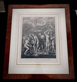 reca impressione su carta vergellata entro una bella e perfetta cornice in radica. Incisore Phlipppe Simoneau grav.r Ord.re du Roy , Misure all’impronta del rame cm 40 x 31,5, Misure cornice cm 67 x 57