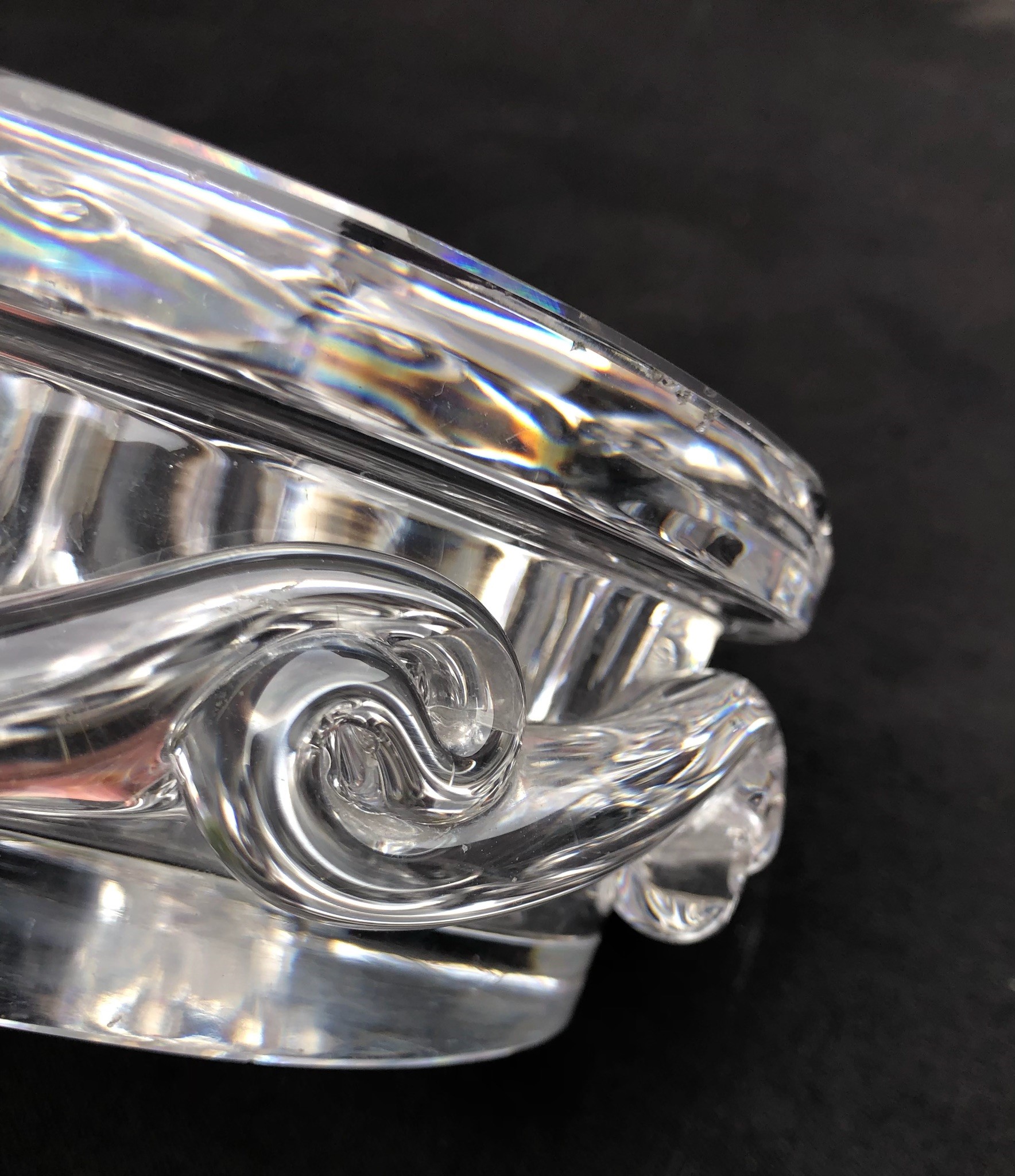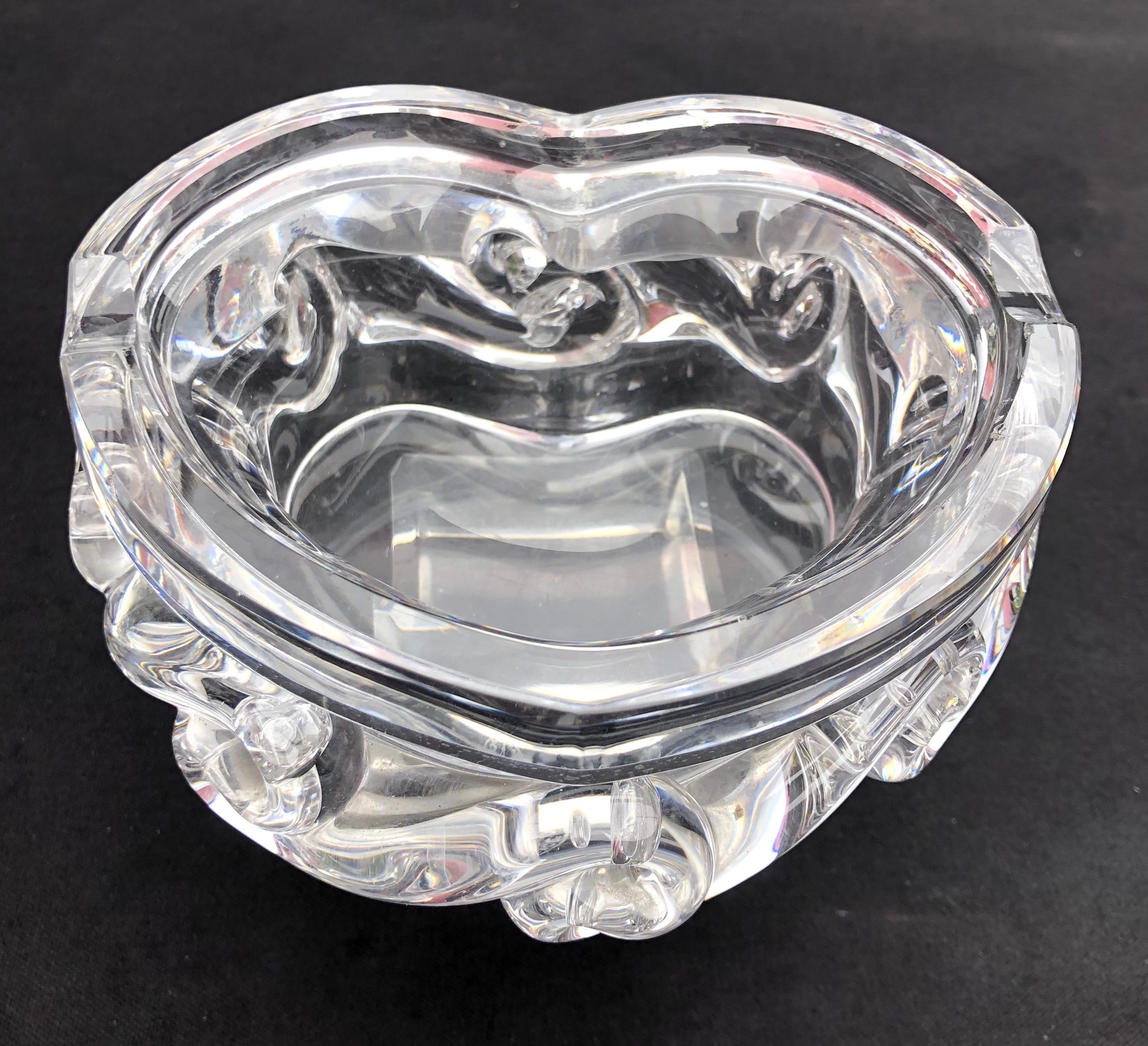 a forma di cuore e decorato con un fregio ondulato lungo i fianchi; marchio “Baccarat France” sabbiato sotto la base. Alcune piccole sbeccature lungo il bordo superiore