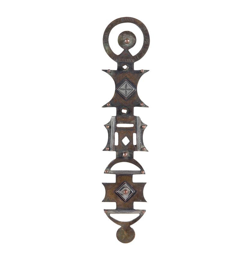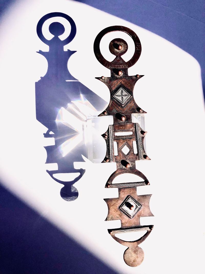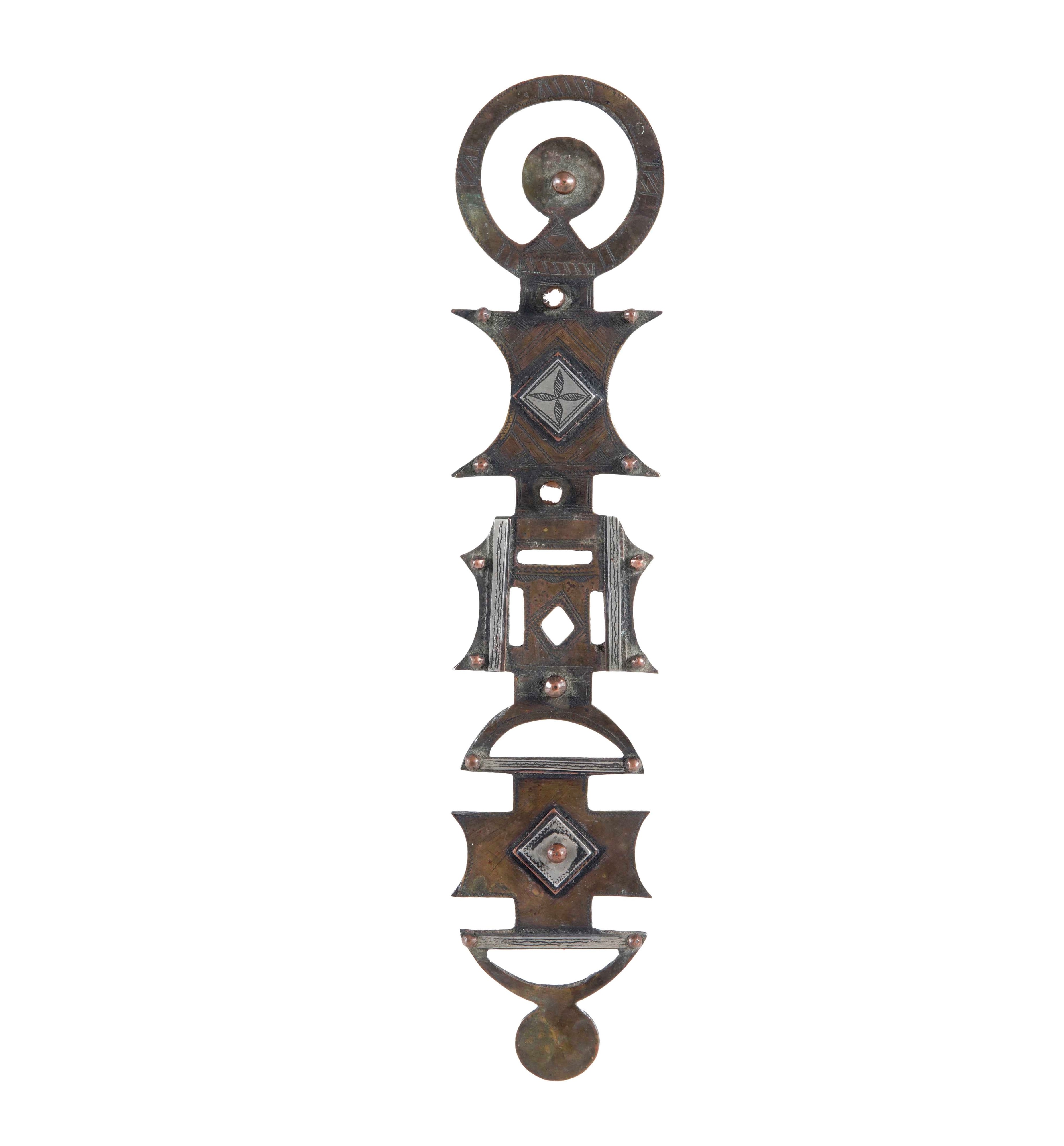 rame, ottone e argento. Lunghezza cm 24,2. Pezzo unico. Questo tipo di gioiello veniva usato dalle donne Tuareg benestanti come contrappeso per il velo.