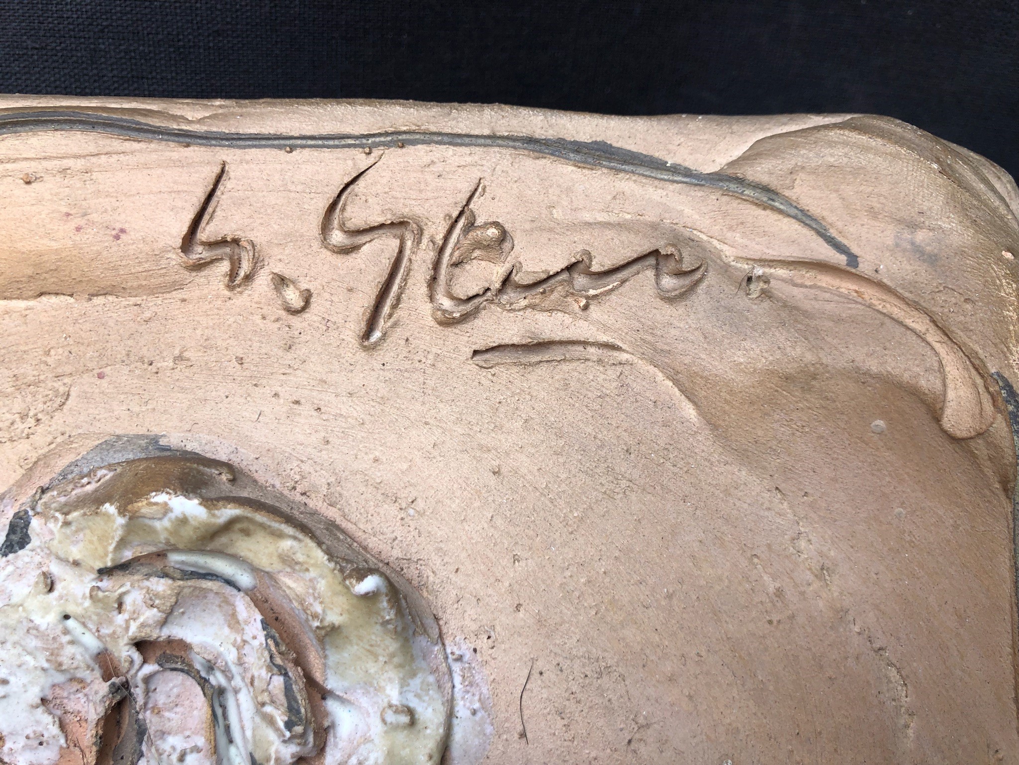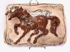 Terracotta in parte smaltata, firma tracciata in alto a dx. L’operare del Ghersi risente qui fortemente dell’influsso di Fontana. Una piccola sbeccatura interna alla criniera di un cavallo assolutamente non percepibile. Per il resto conservazione perfetta.