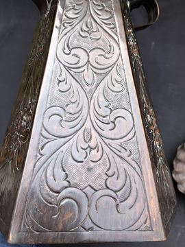 il rame ha corpo ottagonale ed è inciso con motivi floreali su ogni lato; la bugia, in ferro battuto, poggia su tre piedini, ha il corpo baccellato e la presa traforata a forma di foglia