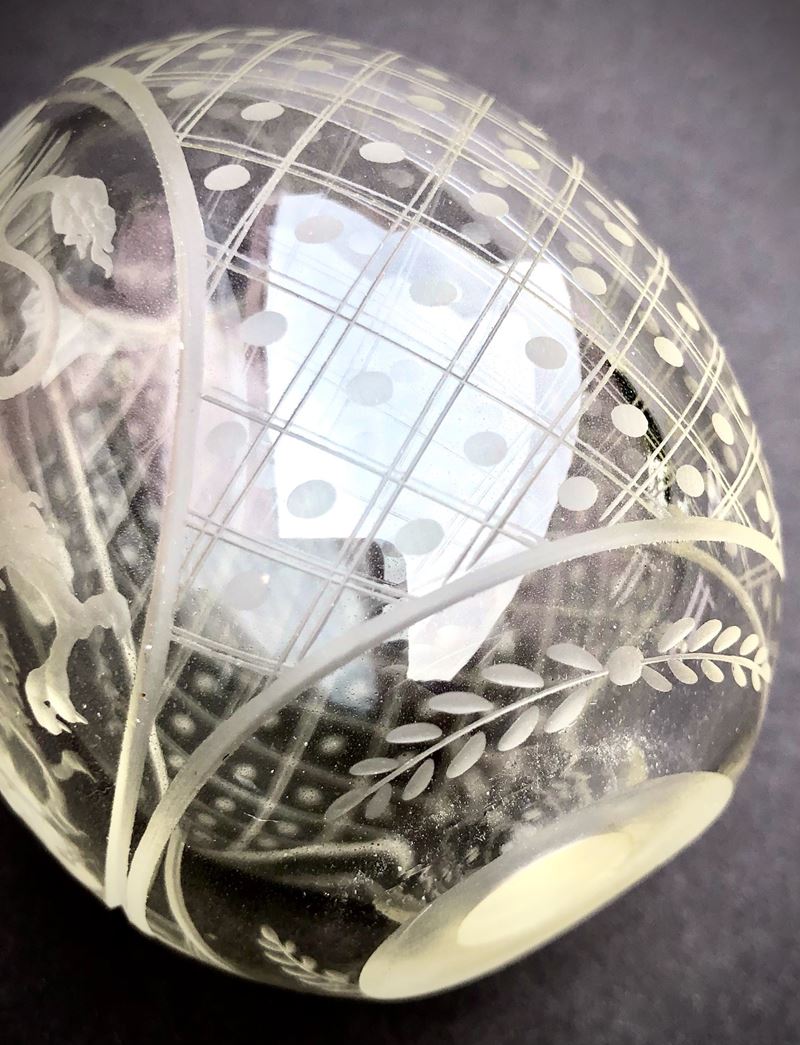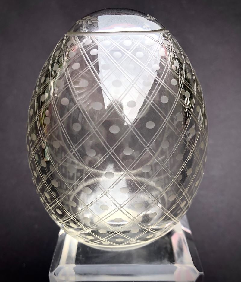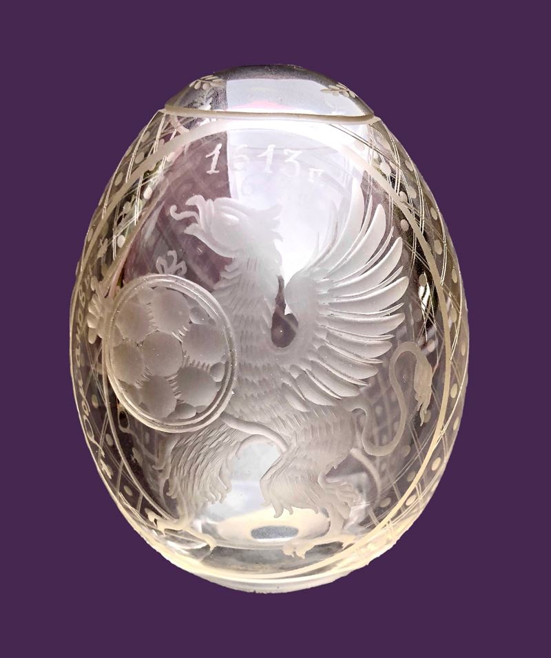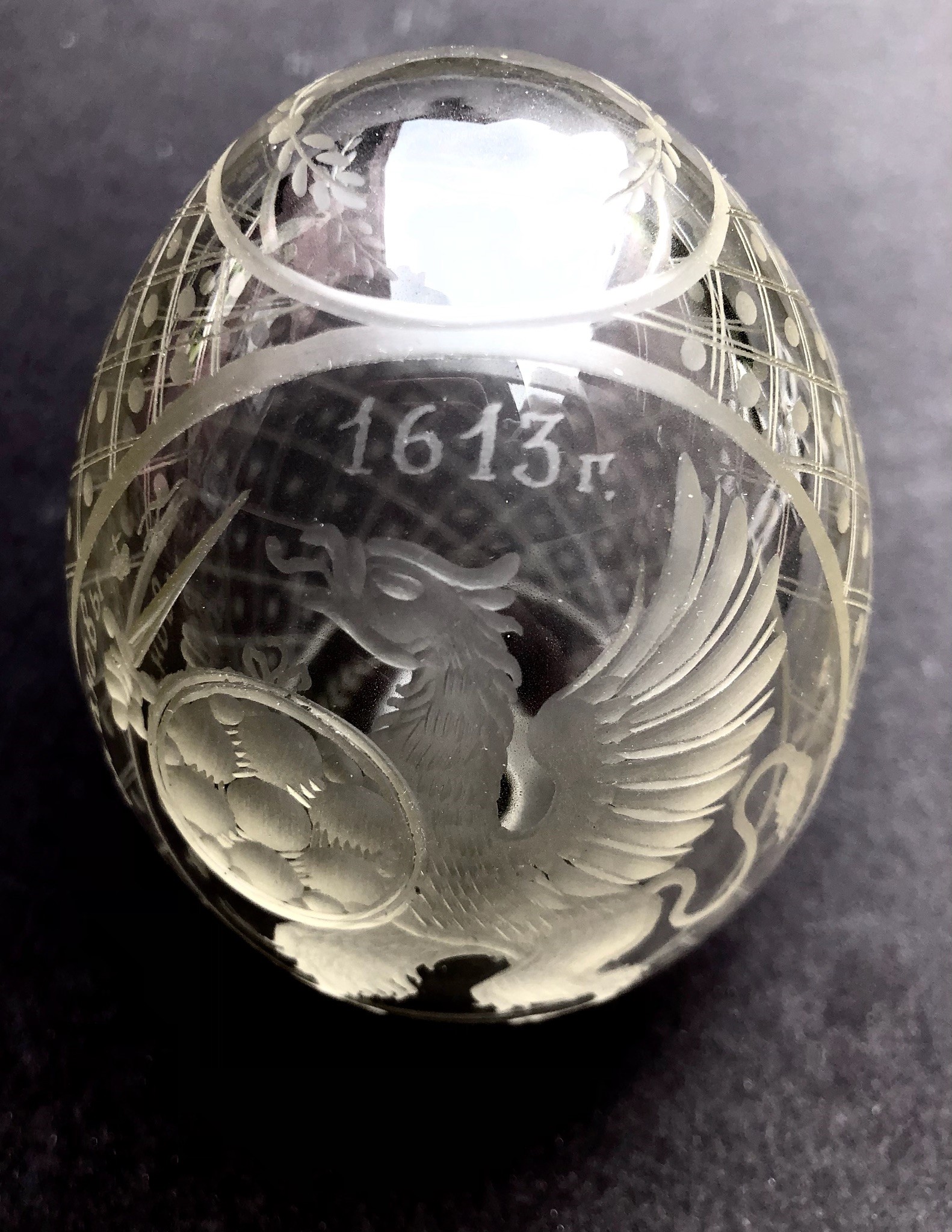 uovo in cristallo interamente inciso alla mola: sul fronte riporta un’aquila araldica rampante che impugna uno scudo e una spada. Sopra la testa dell’aquila compare la data 1613 anno di nascita della dinastia dei Romanov il cui nome compare in verticale a sinistra dell’aquila. Il resto della superfice dell’uovo è inciso con motivi geometrici e, in alto e in basso, con un decoro a palmette. La qualità dell’incisione è superlativa.