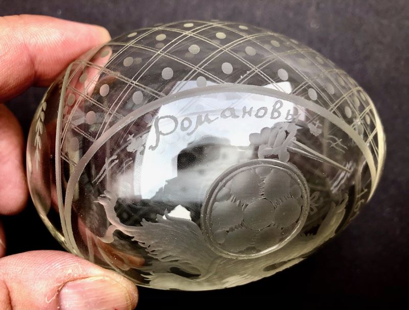 UOVO INCISO ALLA MOLA CON AQUILA RAMPANTE DATA E DEDICA AI ROMANOF, RUSSIA, XX SECOLO