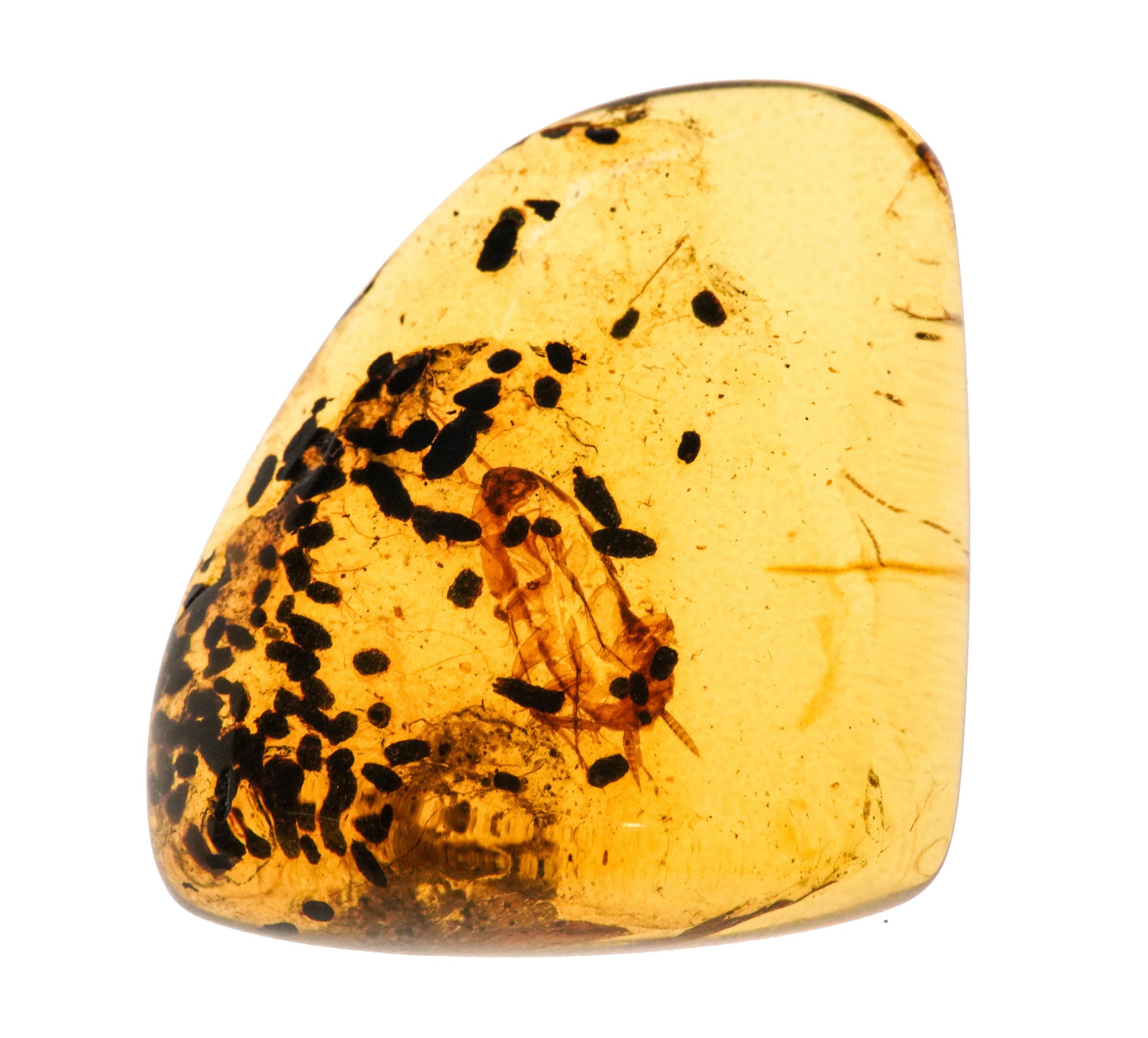 Ambra Birmana (Myanmar) a forma di cabochon, con inclusioni di Blattodea (Scarafaggio) e altri piccoli organismi