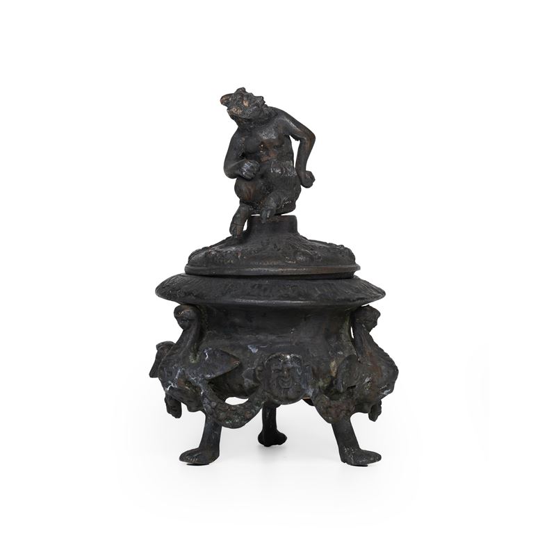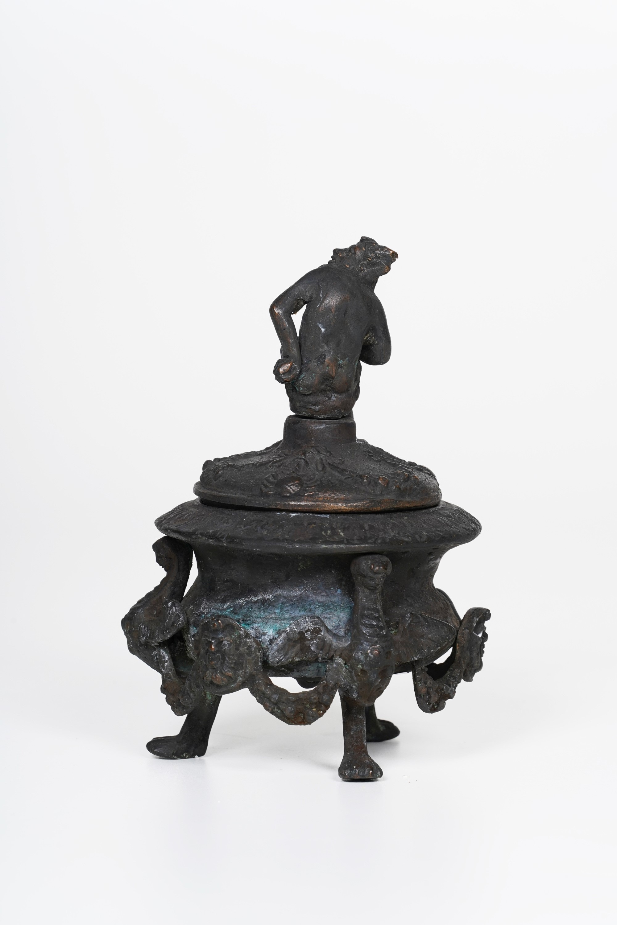 Base tripode con decoro a rilievo ad arpie, coperchio con presa a foggia di satiro