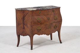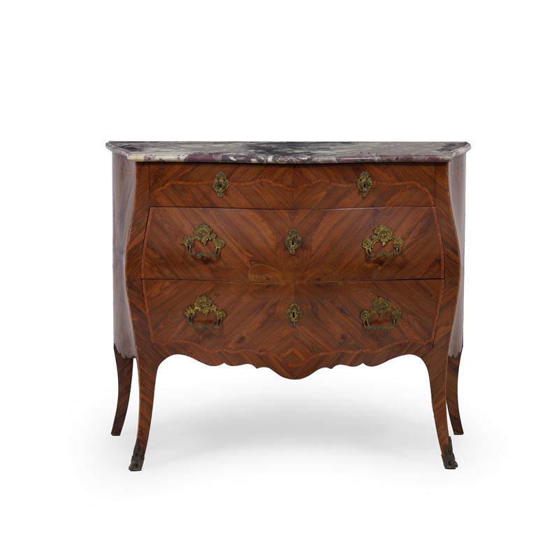 Corpo bombato con fronte a tre cassetti, decoro a quadrifoglio, gambe mosse, piano in marmo sagomato