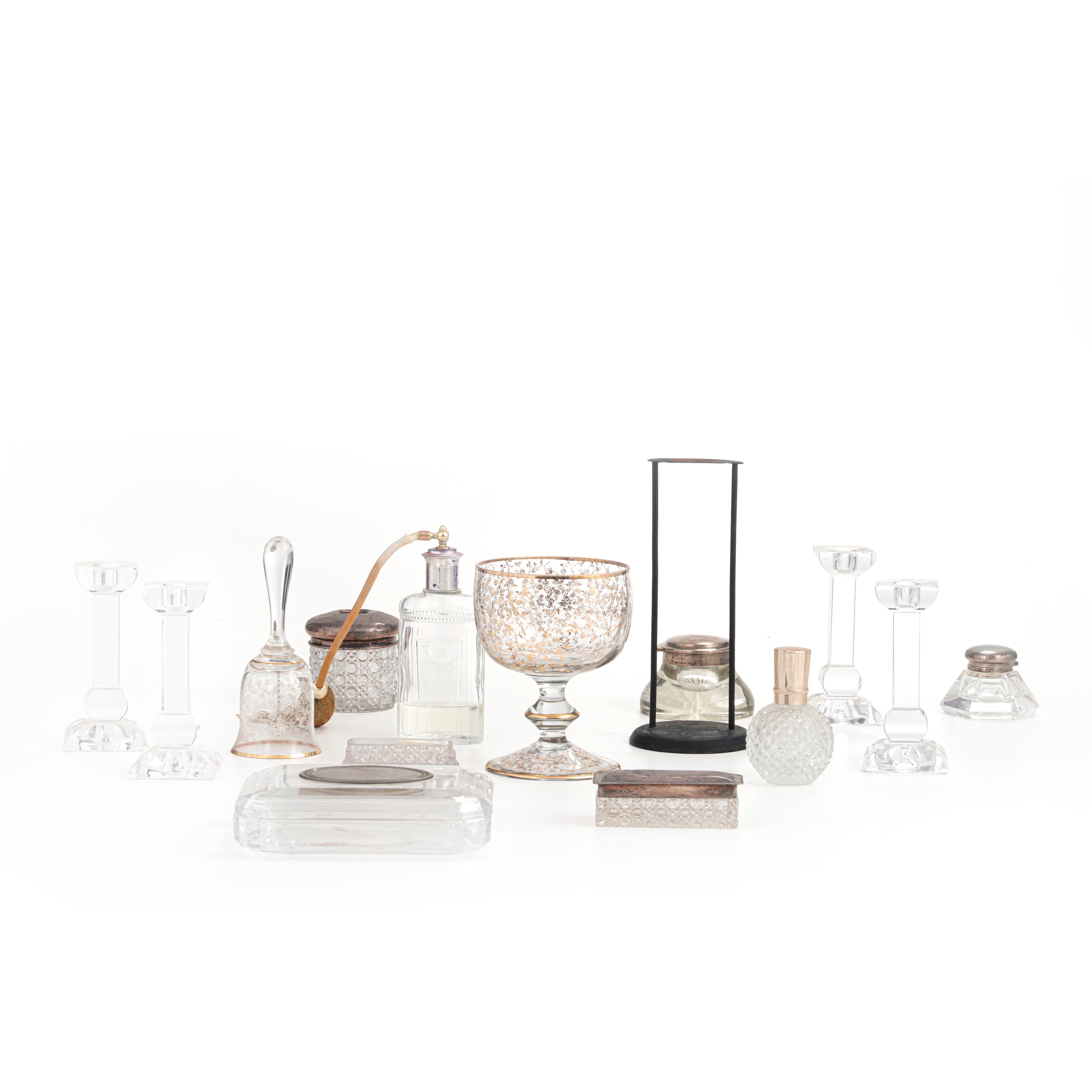 Tra cui una campanella, una coppa, quattro candelieri, due boccette da profumo, alcuni contenitori e due calamai con coperchio in metallo