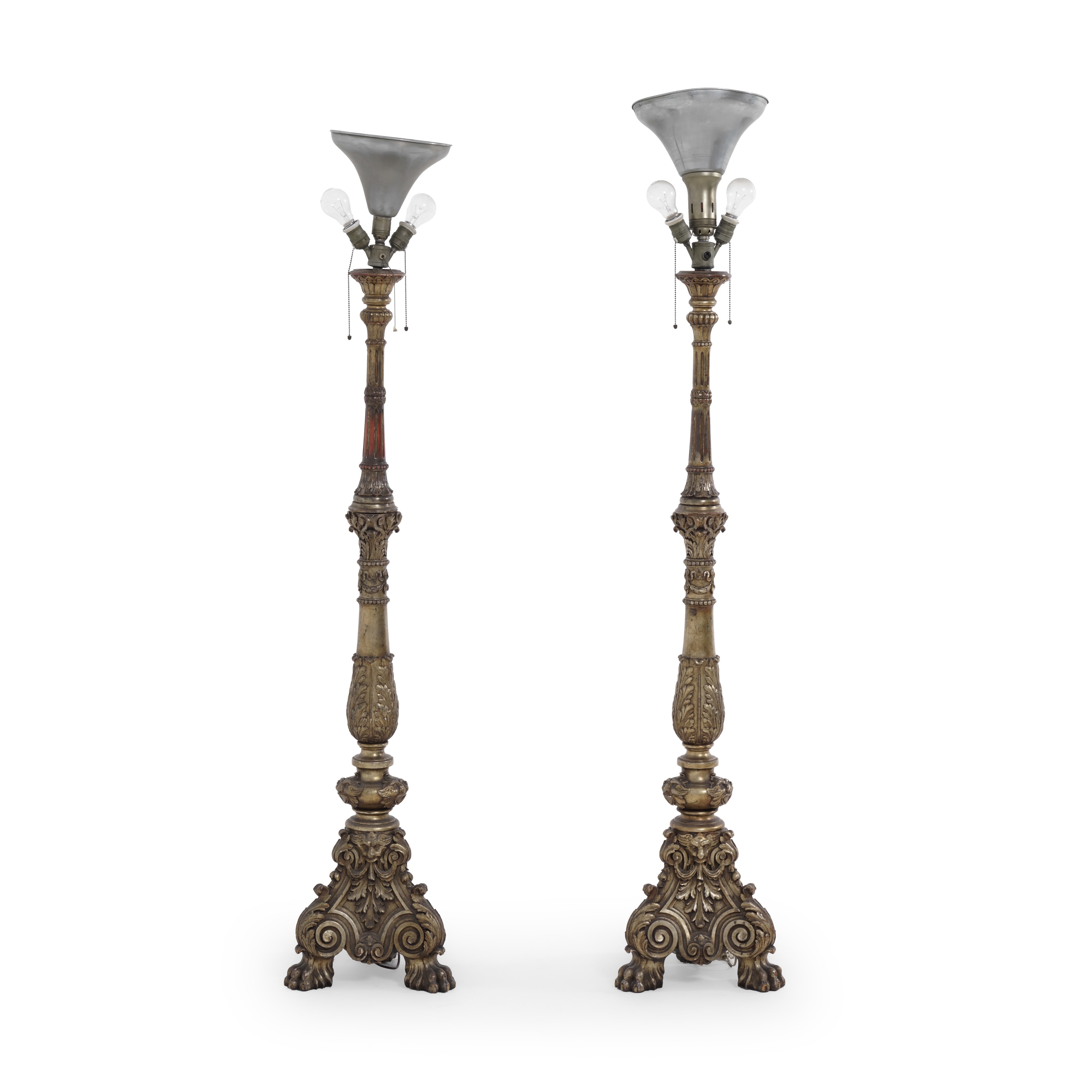 Fusto tornito con decori fitomorfi, tripodi con piedi ferini, predisposti per l'elettrificazione