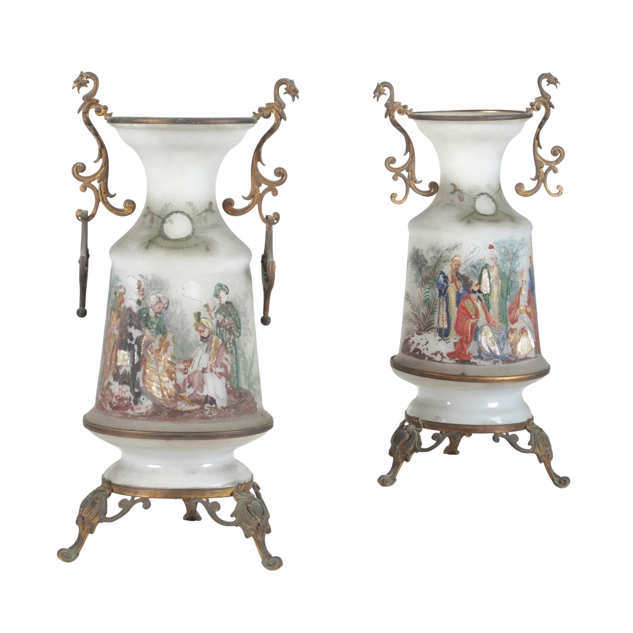 Decoro policromo con scene di genere orientali, basi e anse in bronzo dorato (alcune cadute alla pittura)