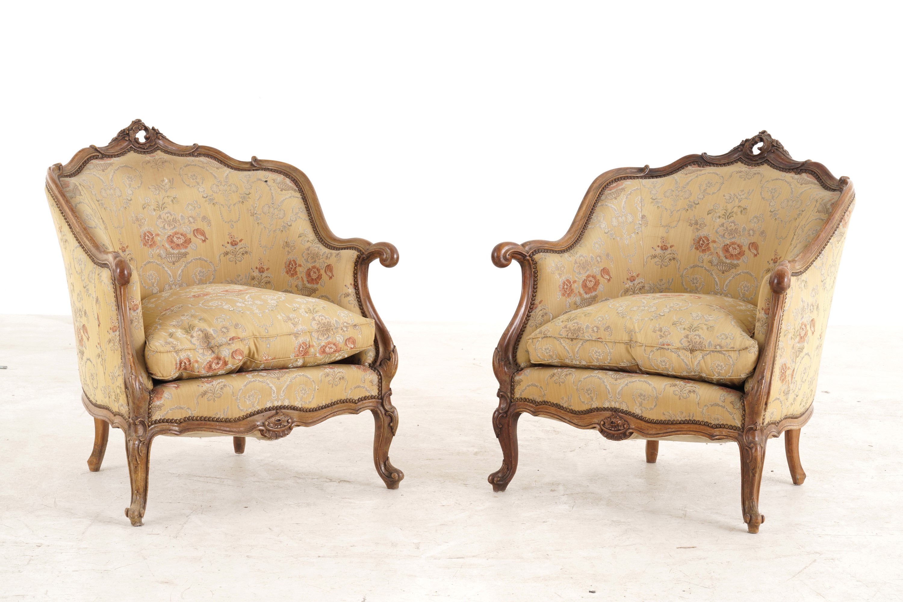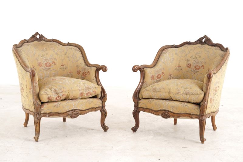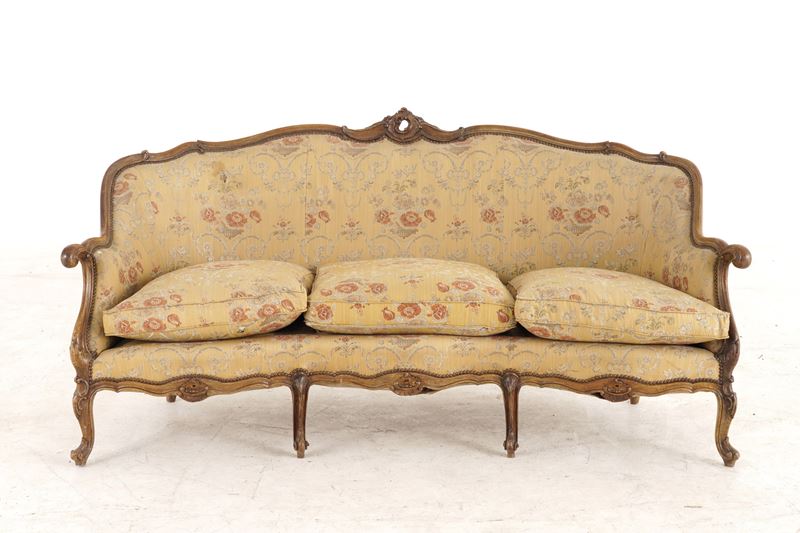 Divano e due poltrone in legno di noce e imbottitura en suite in stile barocchetto