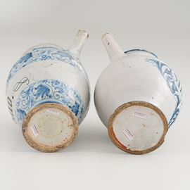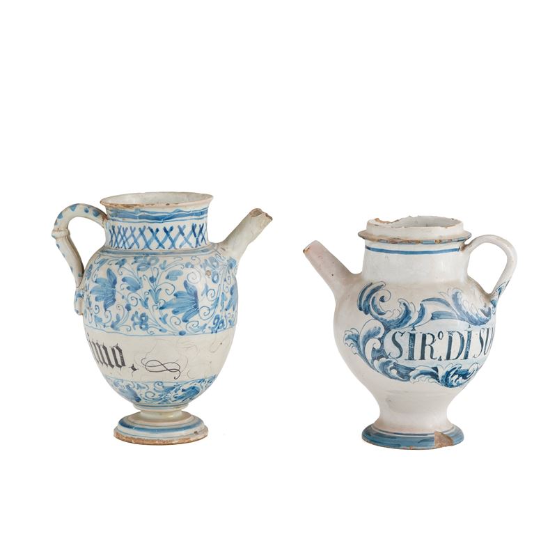 Maiolica. Marca: assente. Altezza massima cm 24. Conservazione: diverse sbeccature ai bordi superiori e a un piede; un beccuccio con rotture