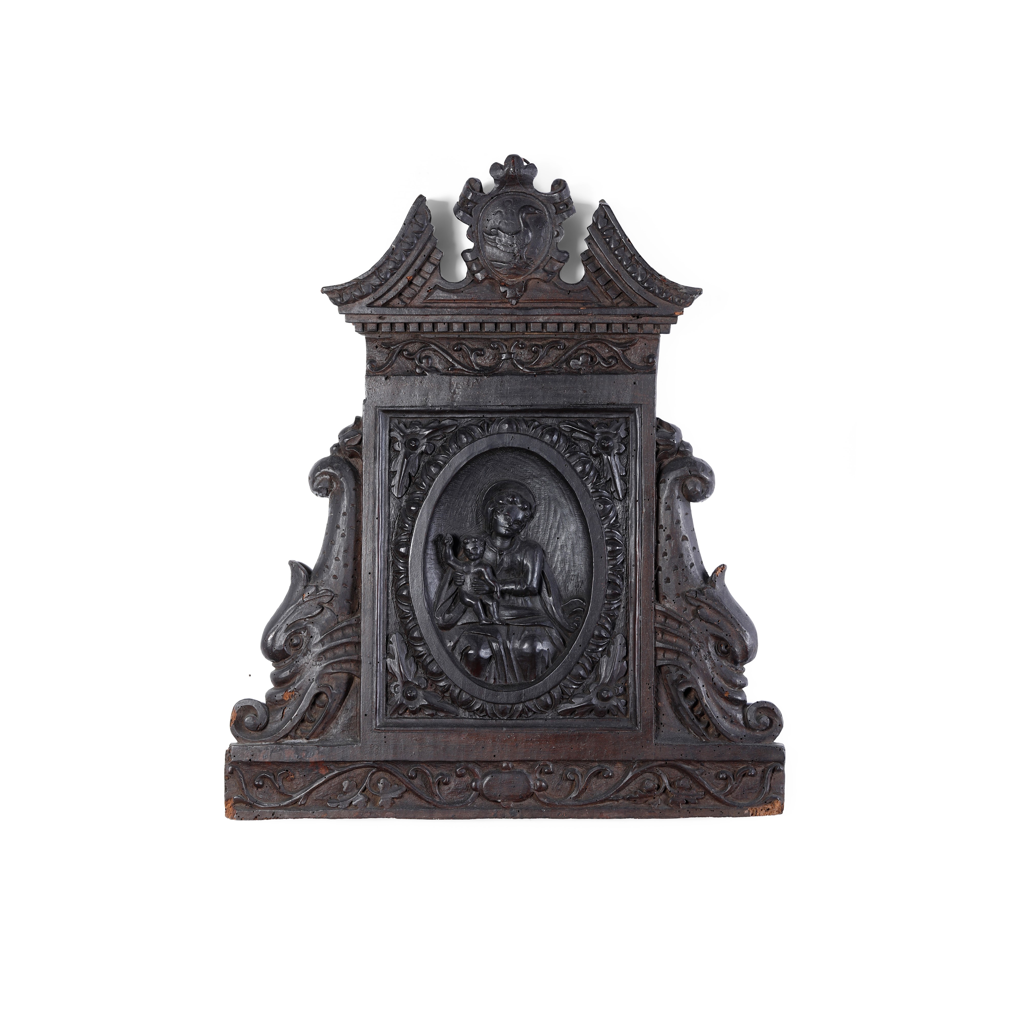 Fregio in legno intagliato con al centro Madonna con Bambino