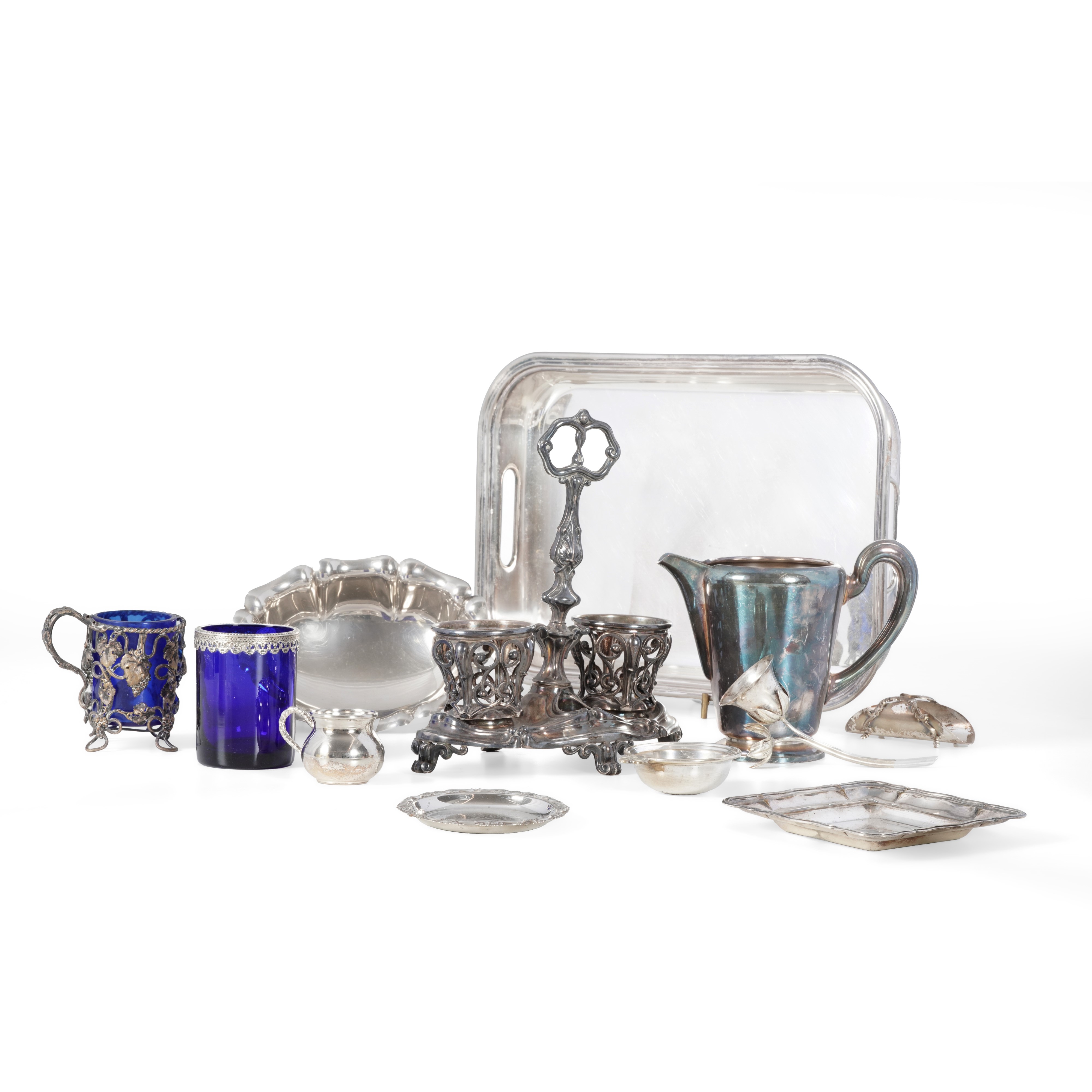 Tra cui un vassoio grande, alcuni vassoietti, la struttura di un'oliera, una bugia e una brocca