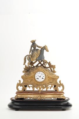 Cassa in bronzo brunito e dorato con cimasa a foggia di amazzone in abiti settecenteschi, quadrante in smalto bianco con numeri romani e firma "G. Sebastianutti, Trieste"