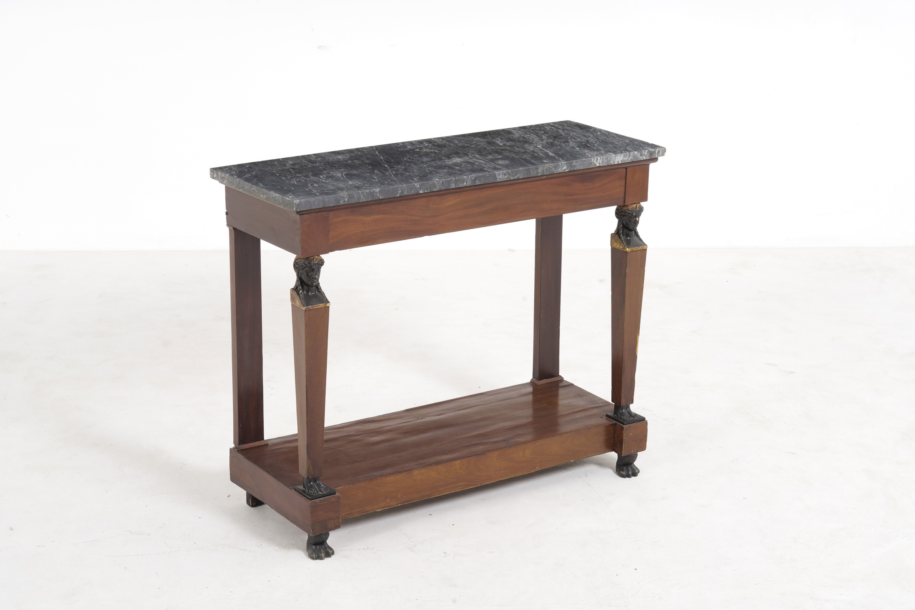 Piano in marmo, gambe frontali a erma con teste femminili e piedi ebanizzati, piedi ferini pure ebanizzati, piano di raccordo