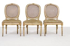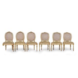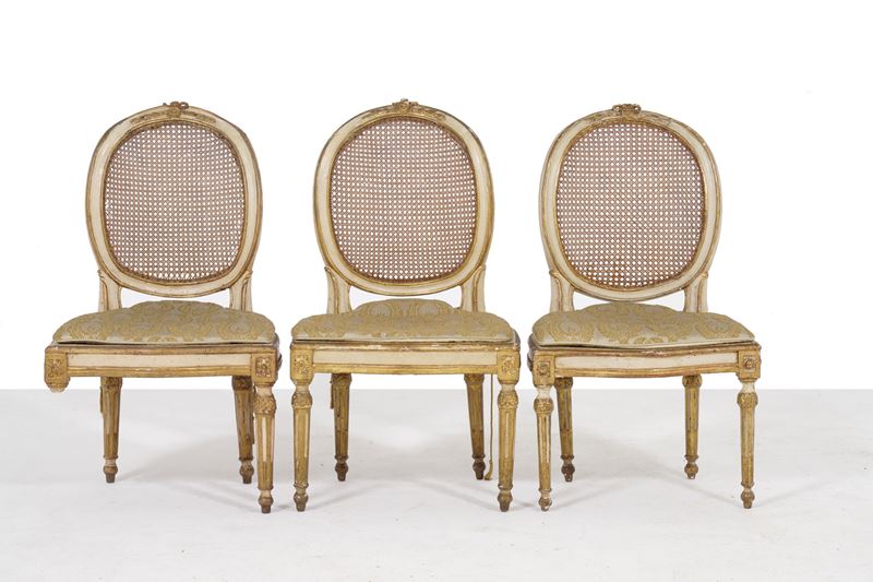 Sei sedie Luigi XVI in legno dipinto e dorato. XIX secolo