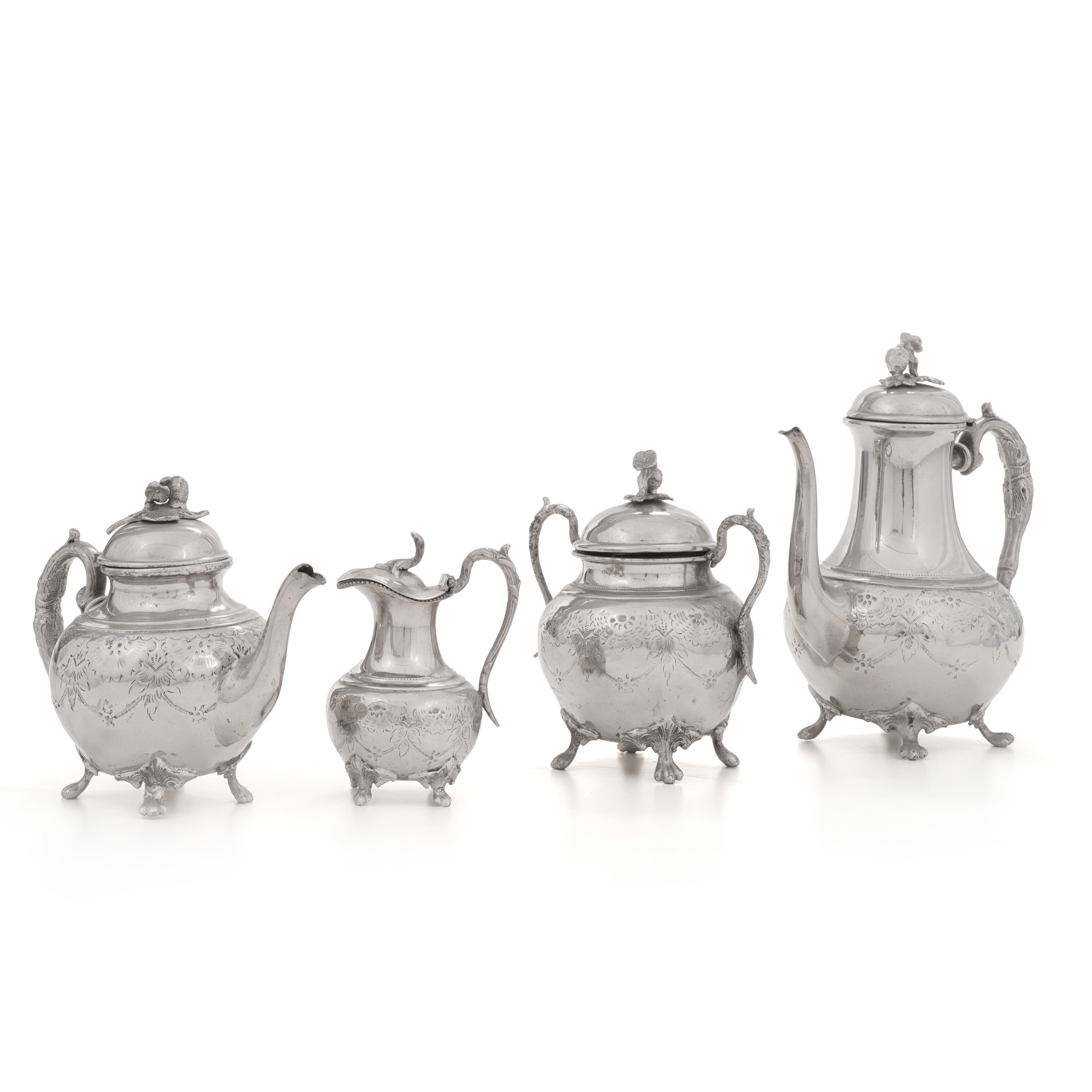 Composto da teiera, caffettiera, lattiera e zuccheriera con coperchio, decoro inciso a festoni, prese a fiori e zoomorfe