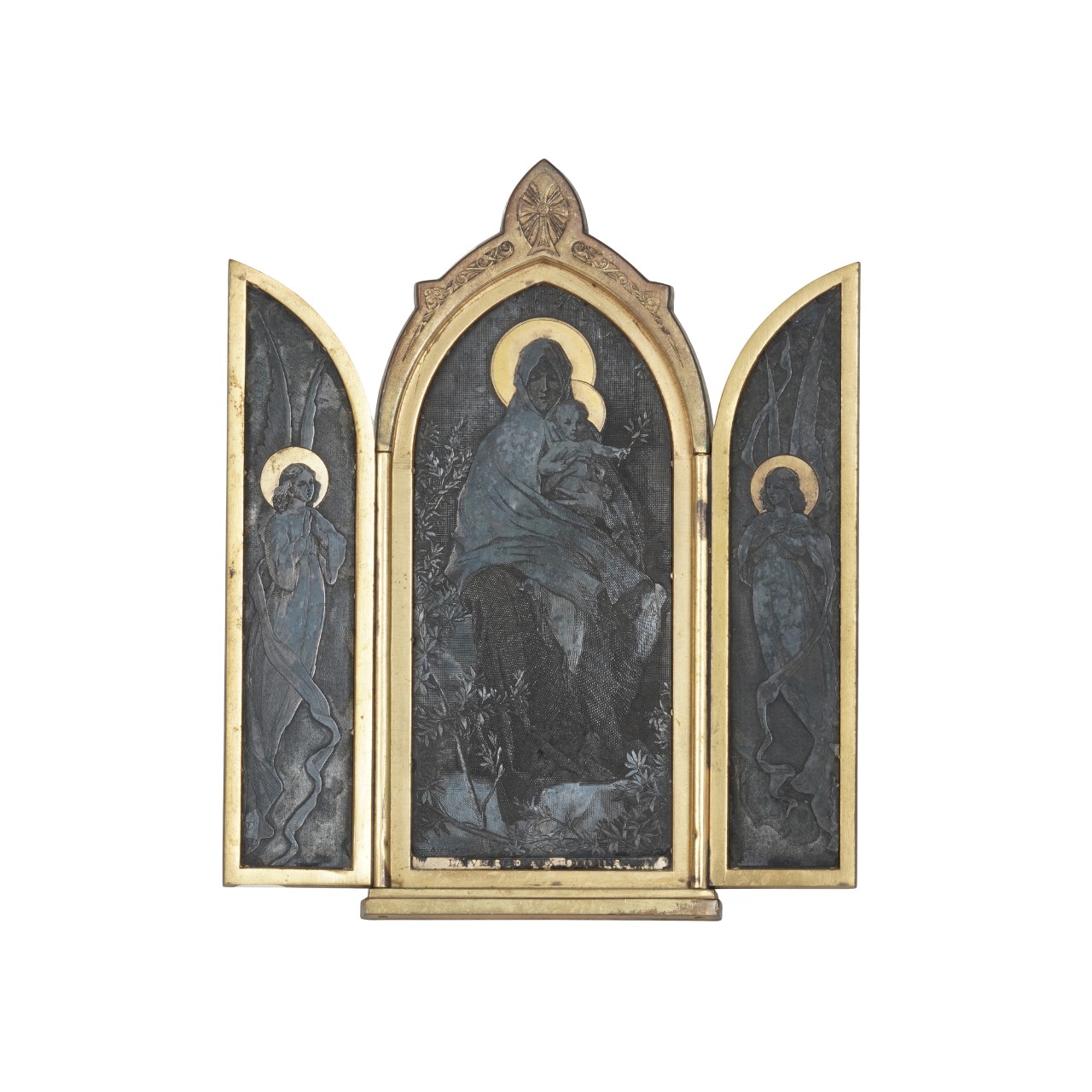 Trittico in bronzo brunito e dorato raffigurante la Vergine con il Bambino e due Santi a grisaille