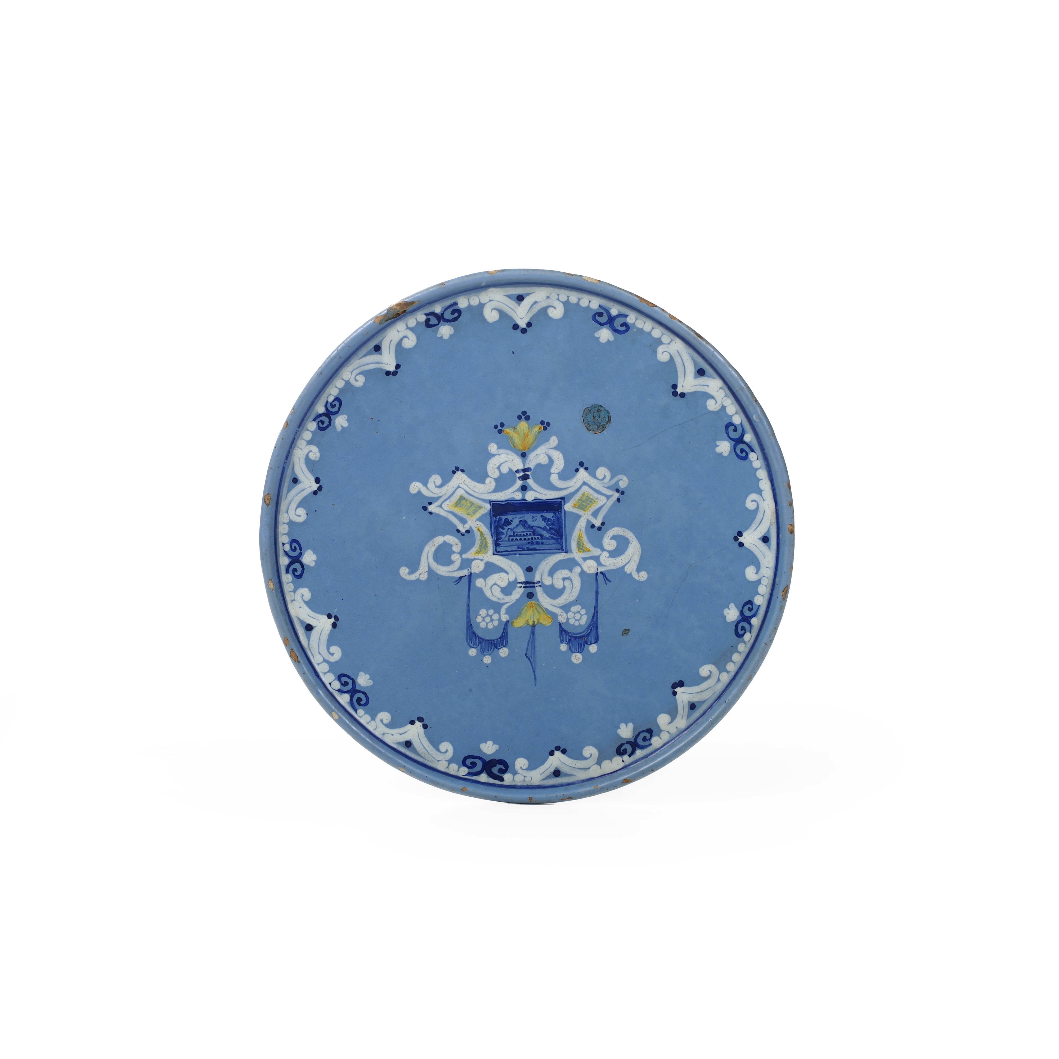 Maiolica. Dimensioni: altezza cm 3,5; diametro cm 26. Conservazione: piccole sbeccature e cadute di smalto; una sbeccatura restaurata.