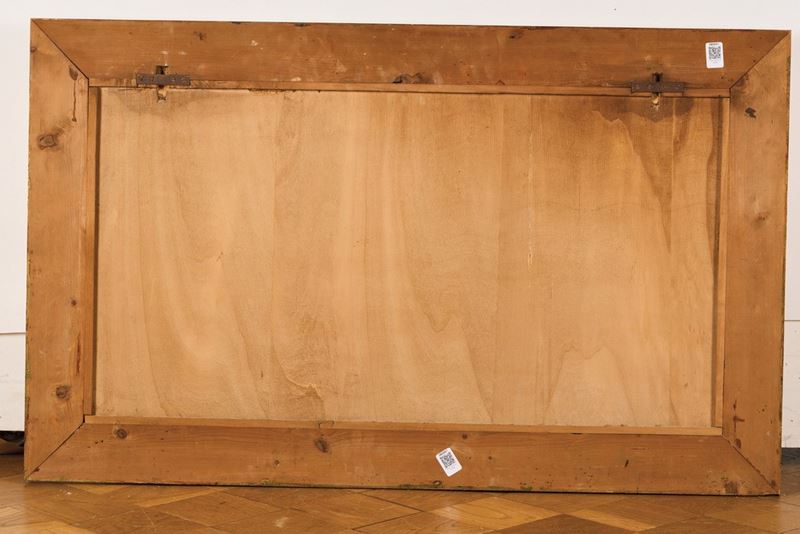 Terracotta smaltata e decorata in policromia. Marca: firma "D Ravano" in nero in basso a destra. Dimensioni: cm 45x90; cornice cm 70,5x115. Conservazione: ottima. Cornice in legno moderna