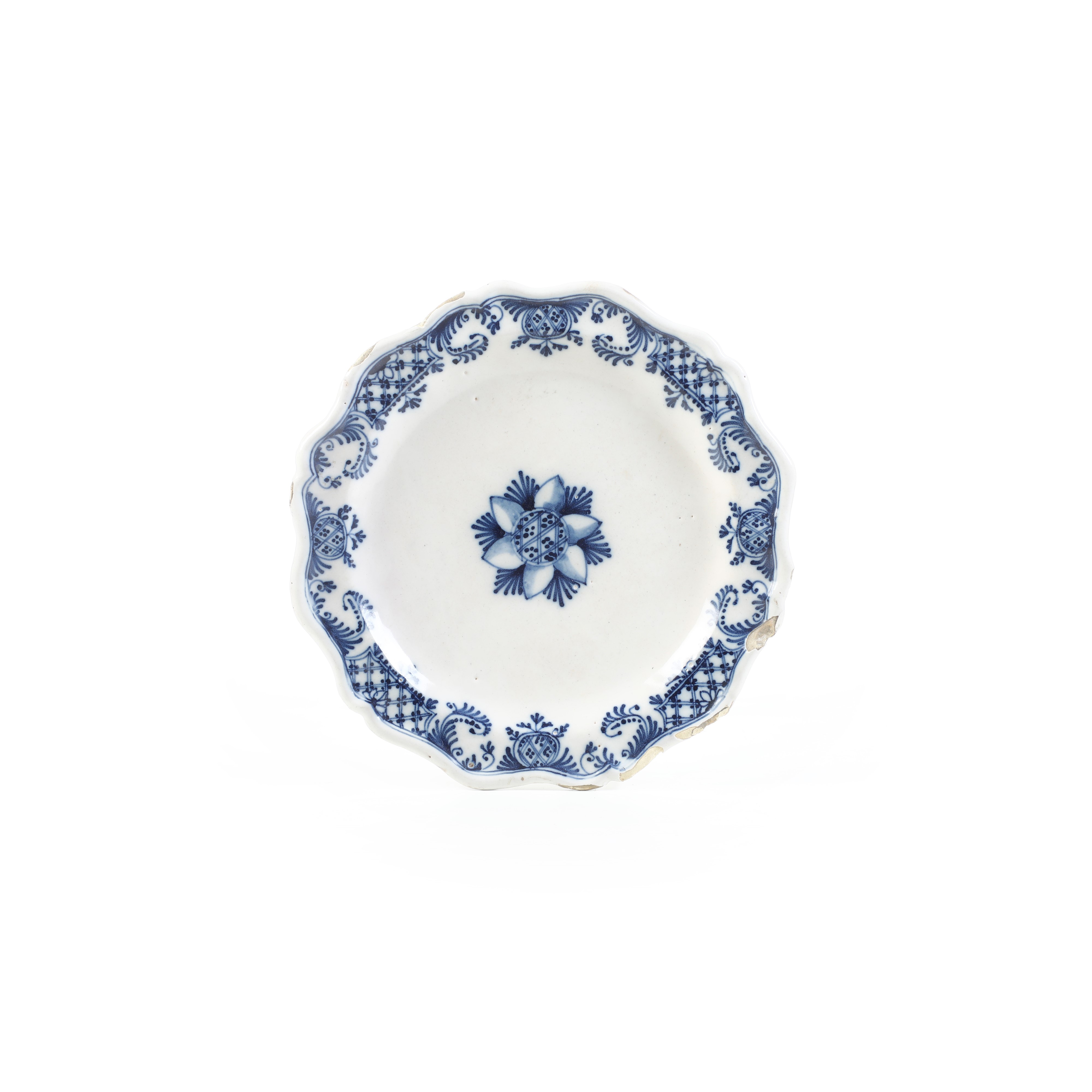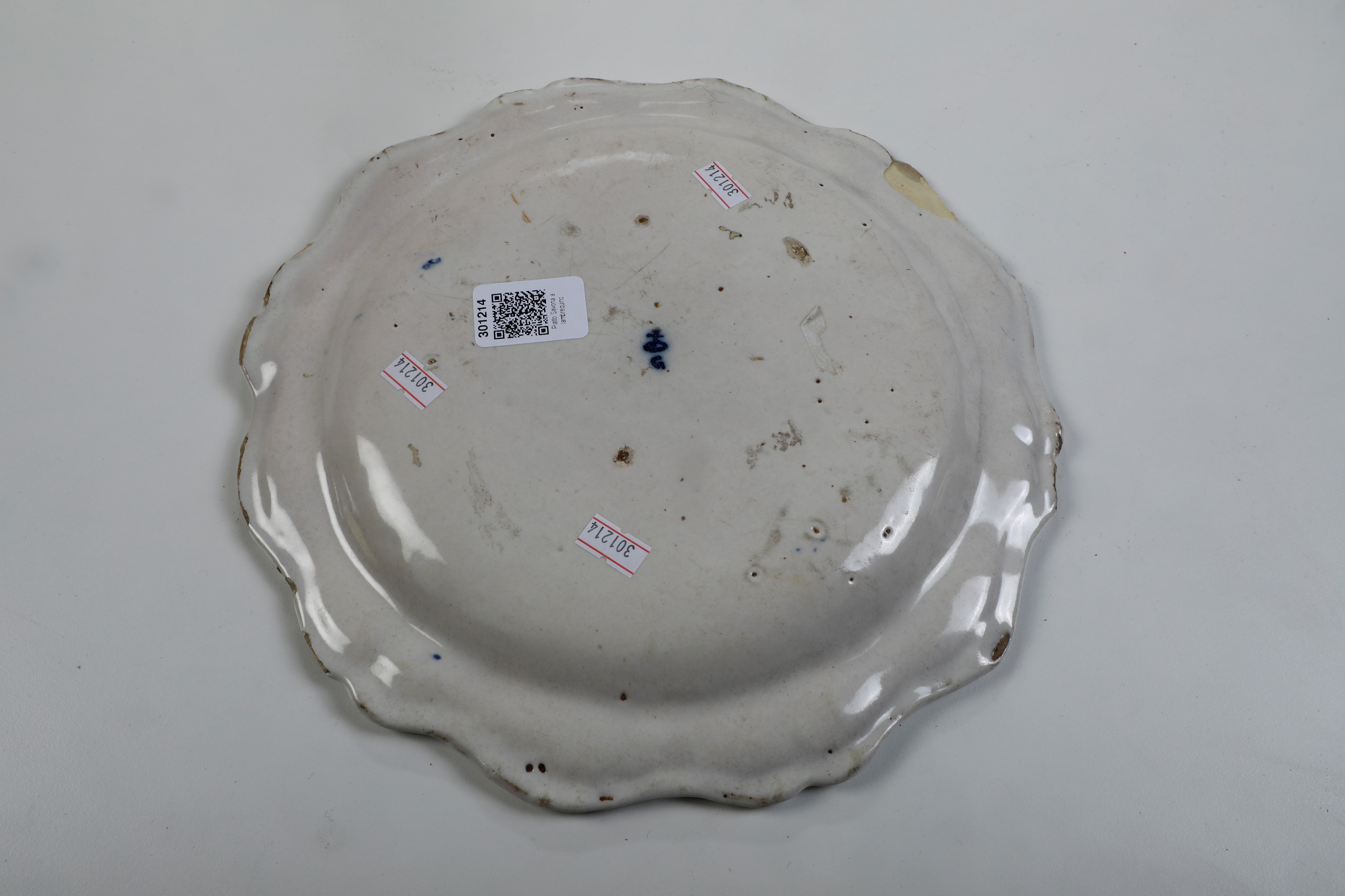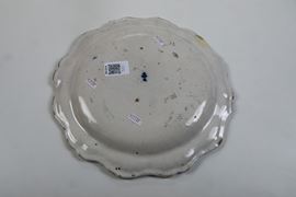 Maiolica monocroma blu a gran fuoco. Marca: globo crucifero e "G" in blu. Diametro cm 29,6. Conservazione: sbeccature al bordo.