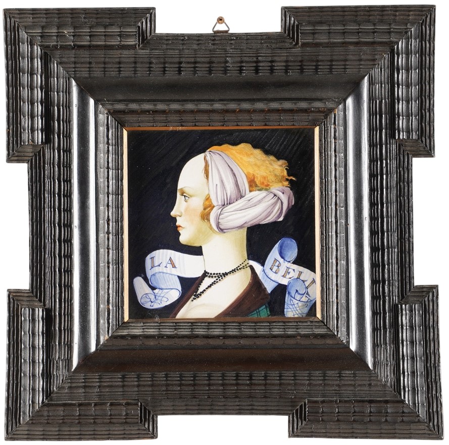 Maiolica. Marca: "Ciccoli Pesaro". Dimensioni: cm 20x20. Conservazione: ottima. Cornice in legno cm 41,5x41,5.