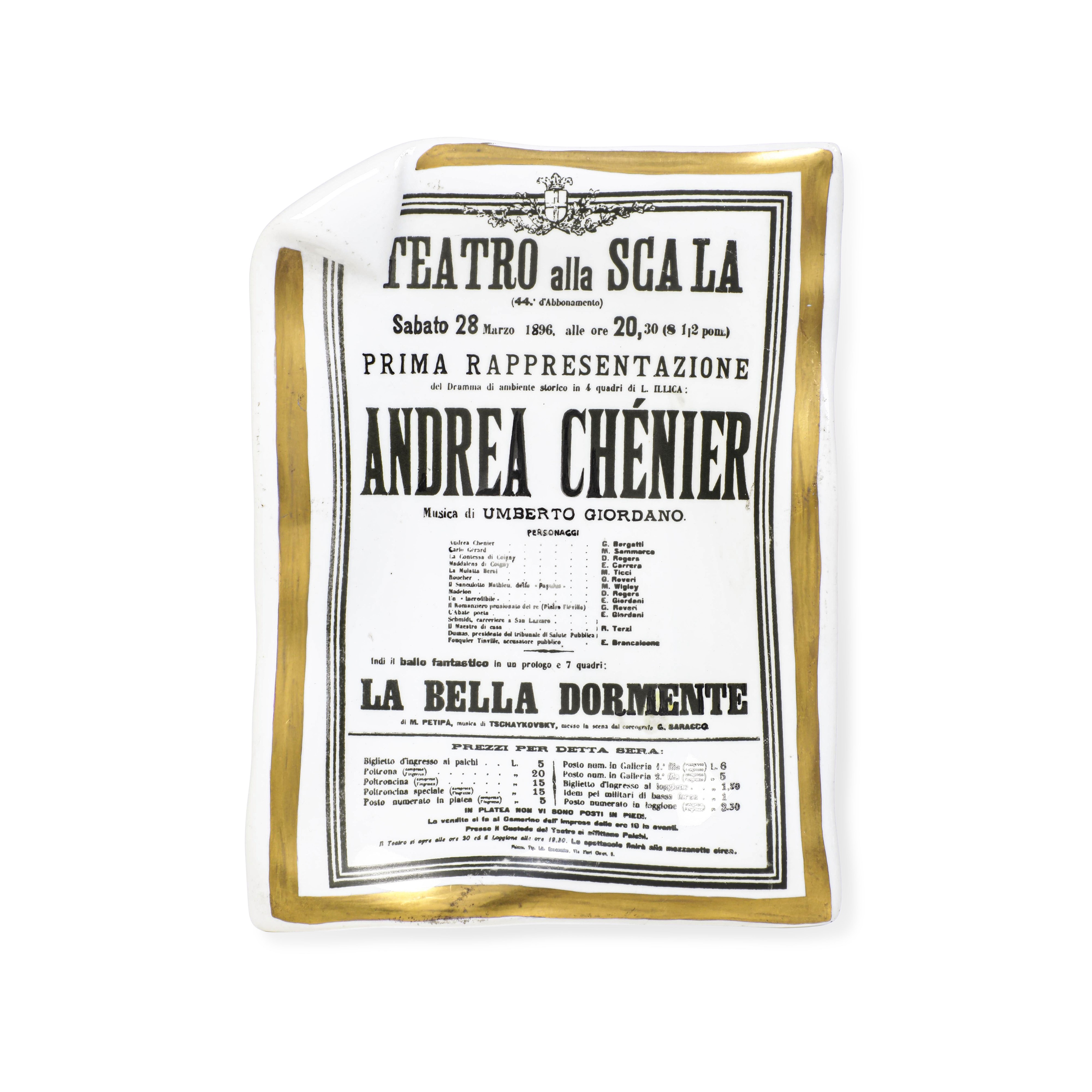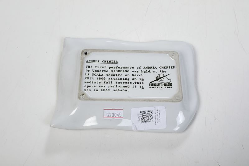 Il vassoietto è un omaggio alla prima rappresentazione alla Scala dell'opera Andrea Chènier di Umberto Giordano avvenuta il 28 marzo 1896 come risulta sia dalla decorazione che dalla didascalia posta sulla retro.