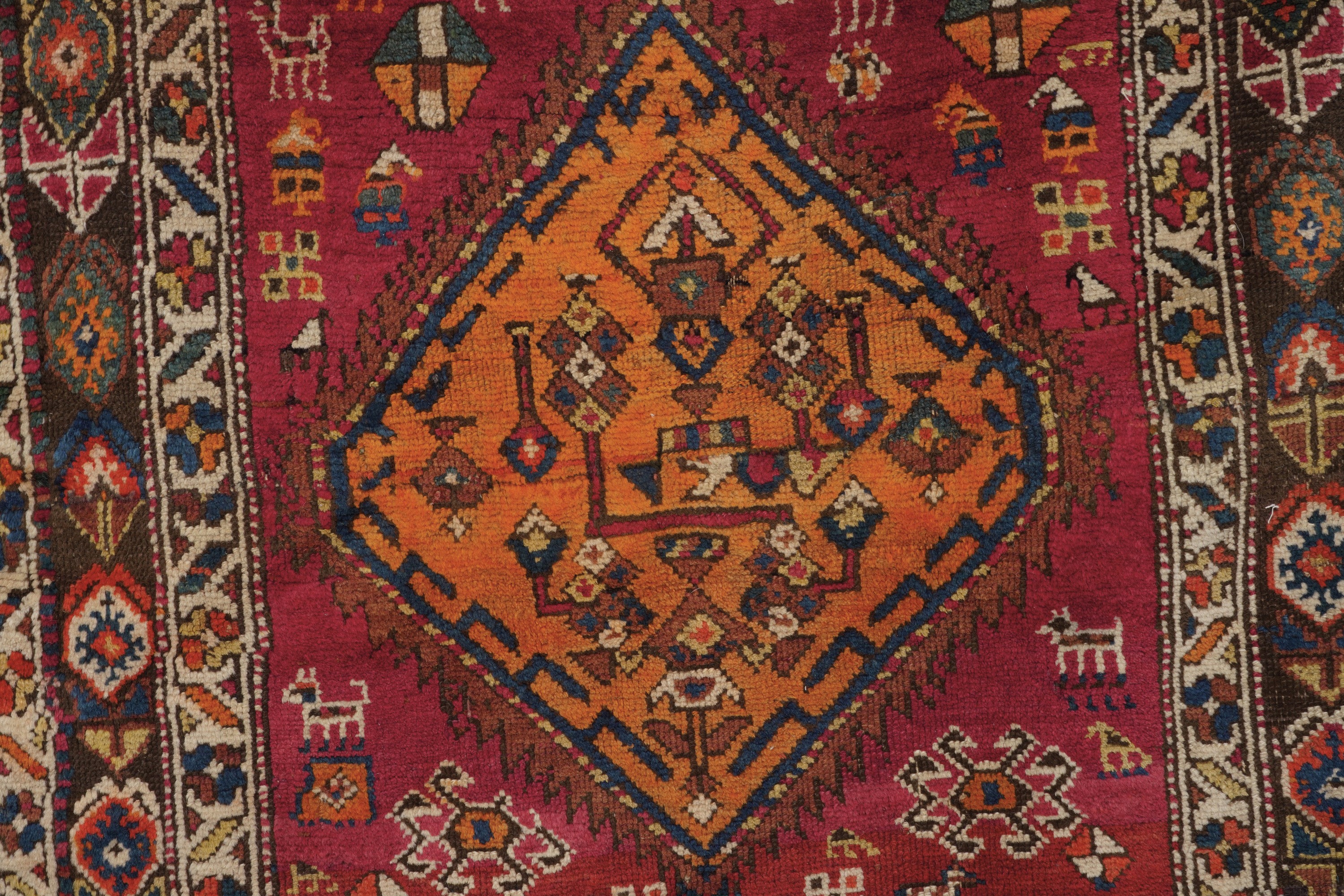 campo rosso con medaglioni sovrapposti, circondati da gul, animali, bothe, figure e alberi