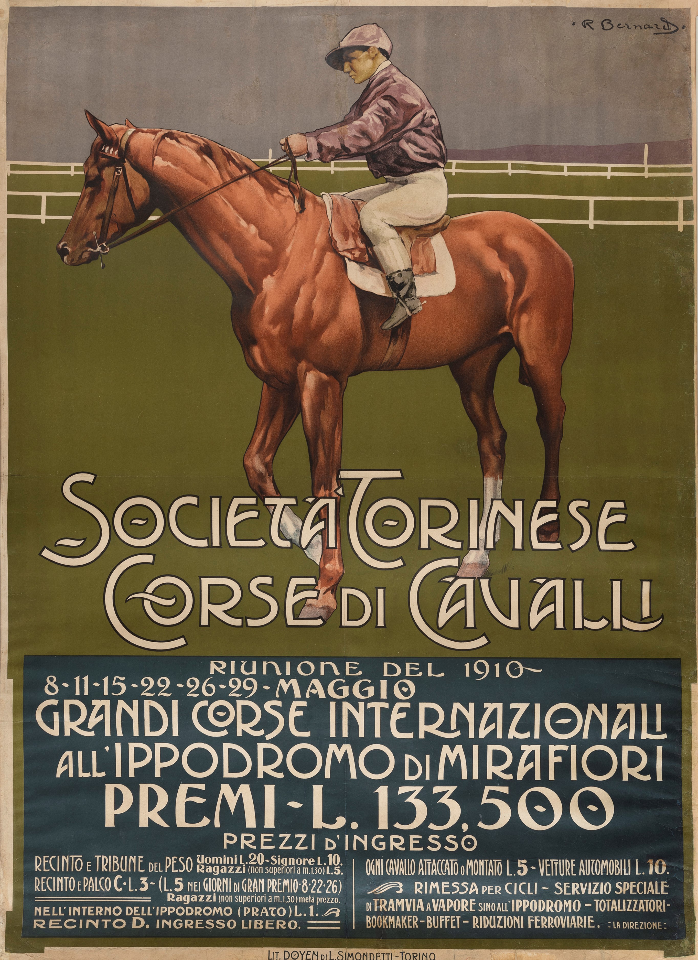 Affisso litografico, 1910. Impresso da Lit. Doyen Simondetti - Torino. Cm 138 x 98. Telato. Qualità B/C