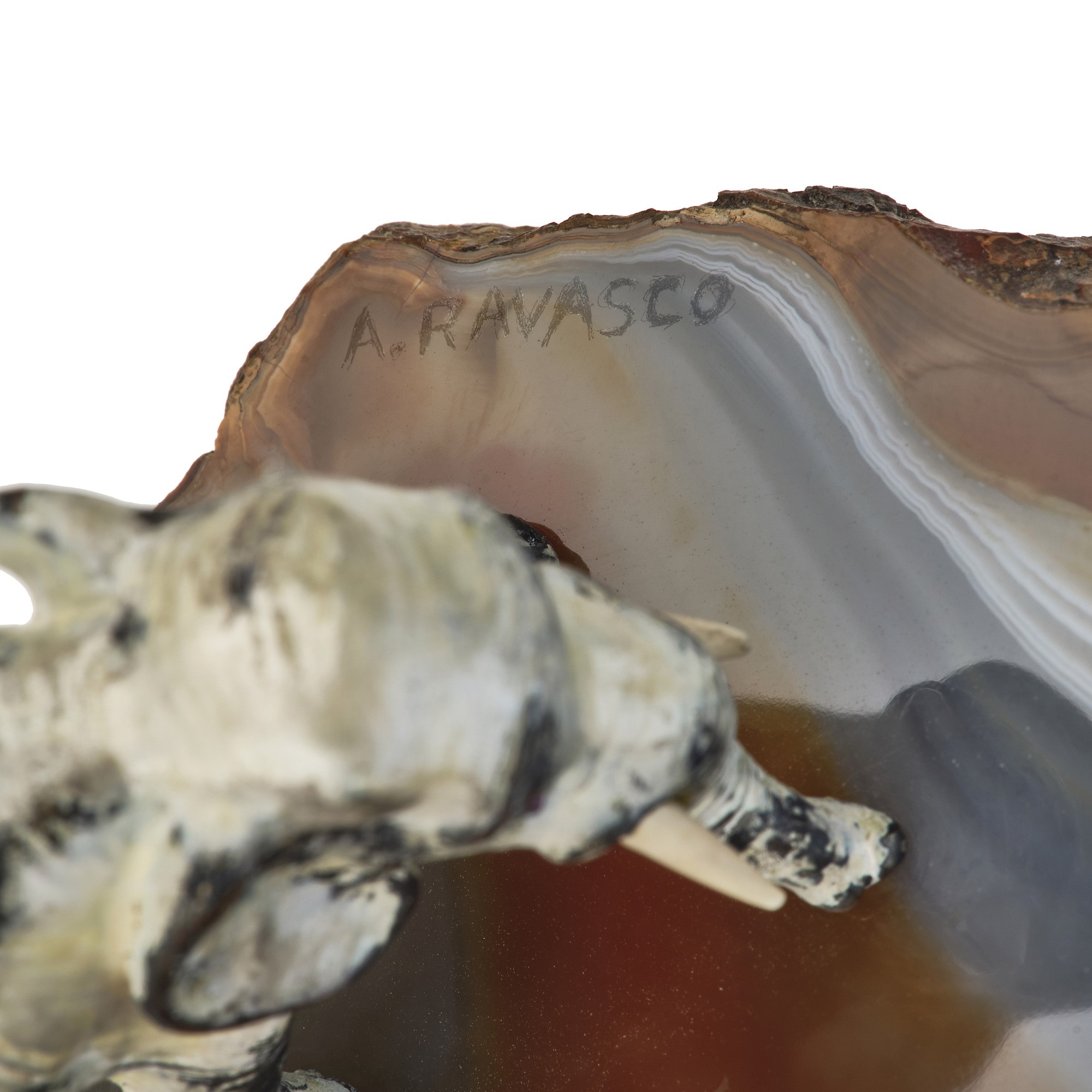 Alfredo Ravasco. Portaoggetti in agata con "elefante" in argento, smalti policromi e perla