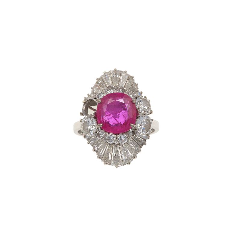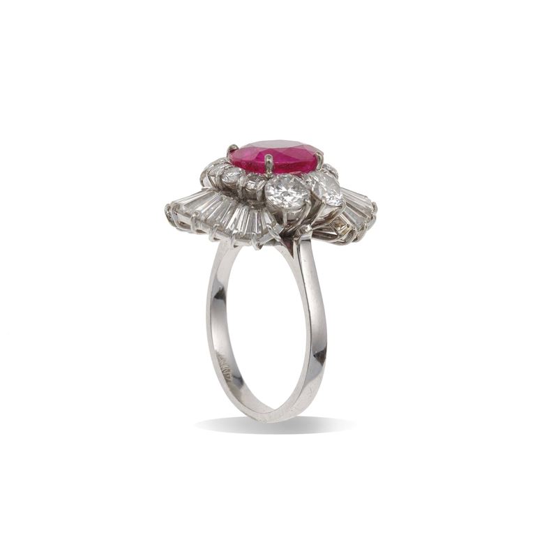 Anello con rubino Burma, olio rosso nelle cavità, di ct 2.00 circa, e diamanti a contorno